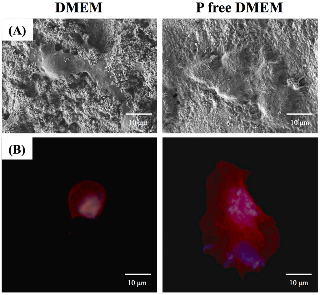The facilitation of cell adhesion on CS using different DMEMs was confirmed and observed using SEM (Figure 6A) and immunofluorescence images (Figure 6B). When the hDPCs were seeded onto CS substrates with DMEM for 3 h, the cells barely adhered or spread, whereas the cells cultured on CS with P-free DMEM exhibited normal adhesion. Fluorescence staining shows that at the same time point, hPDLs cultured on CS with P-free DMEM clearly displays the F-actin stress fiber morphologies of the cells (Figure 6B). In contrast, cells on the CS with DMEM exhibit a rounded morphology.