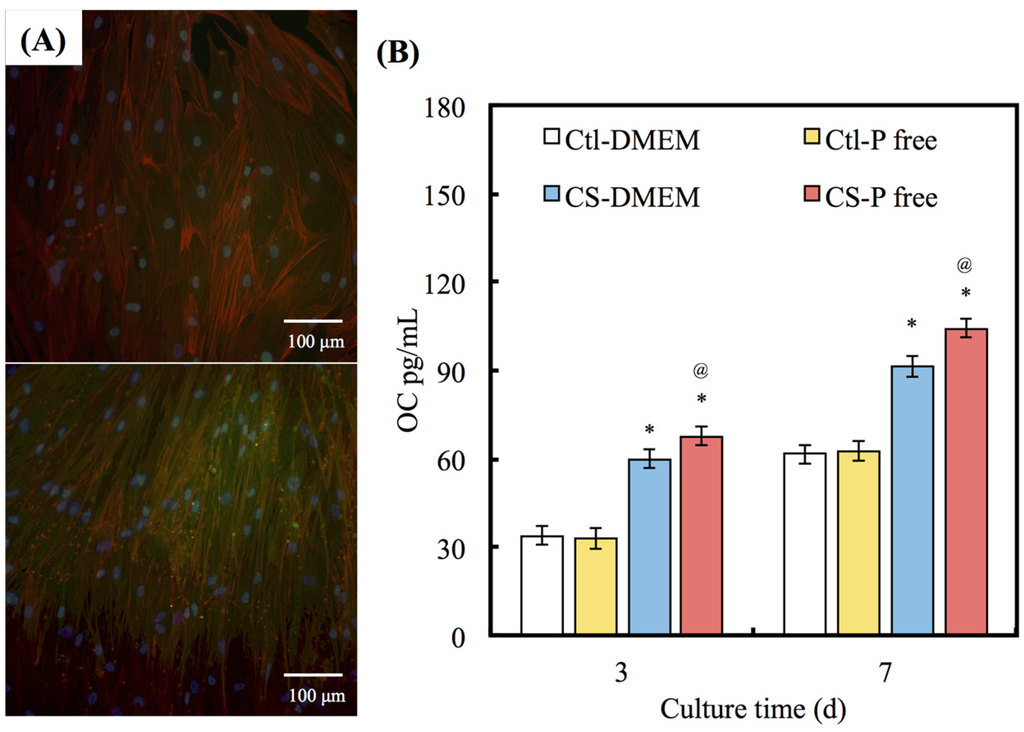 To further investigate the effects of apatite precipitate on hDPCs functions, OC was analyzed using immunofluorescence microscopy (Figure 7A). Visual examination shows that hDPCs cultured on the CS surfaces with P-free DMEM exhibit comparatively higher fluorescence intensity than those with DMEM after 7 days. Figure 7B shows the analysis of quantitative examination data and the OC activity of cells cultured on the different DMEMs for 3 and 7 days. The results show that OC levels increase in proportion with incubation time. A significant (13.1% and 15.2%) increase (p < 0.05) in the OC level was measured for CS in the P-free DMEM in comparison with the DMEM for 3 and 7 days, respectively. Interestingly, no significant differences (p > 0.05) were observable between the DMEM and the P-free DMEM in Ctl group for all time points.