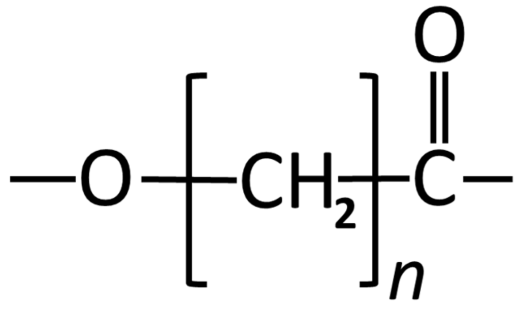 Poly(ε-caprolactone) (PCL) is an aliphatic polyester that is a semi-crystalline polyester and can be processed in various forms due to it being highly soluble in a variety of organic solvent [,] (Figure 3). PCL is a polymer that has a very high thermal stability when compared with other aliphatic polymers [,]. The decomposition temperature (Td) of PCL is 350 °C, while the Td of aliphatic polyesters is usually between 235 °C and 255 °C [].