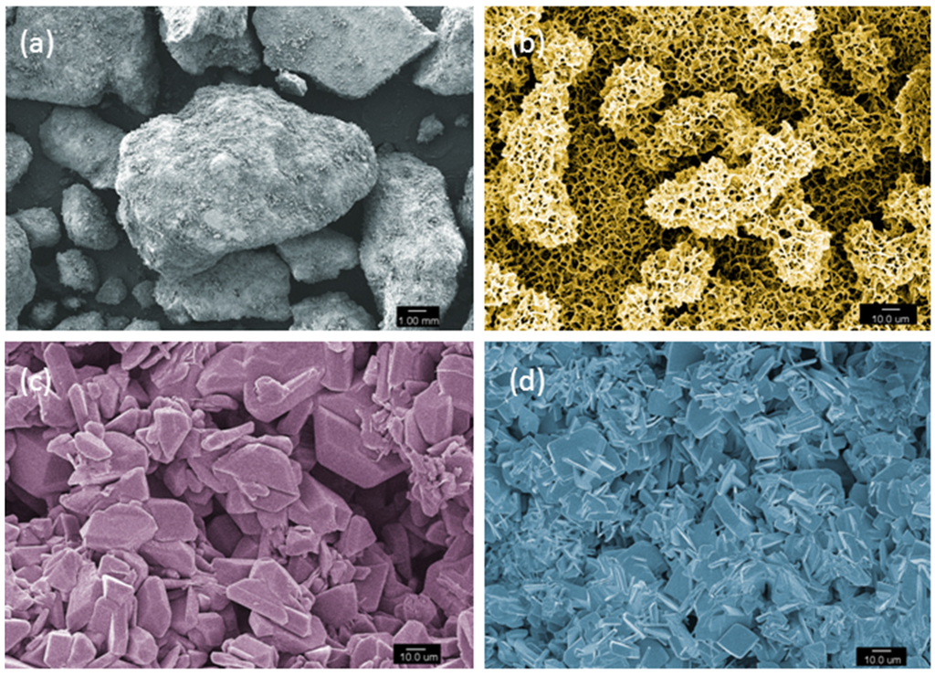 Scanning electron microscope micrographs of (a) β-Tricalcium phosphate granules; 50× magnification; (b) Hydroxyapatite, 5000× magnification; (c) Dicalcium phosphate dihydrate crystals, 5000× magnification; (d) Dicalcium phosphate anhydrous crystals, 5000× magnification.