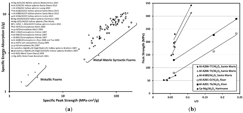Figure 1a. To eliminate errors based on differing definition of material properties, the peak strength and energy absorption properties were determined directly from stress–strain plots provided in each publication. This figure shows the potential superiority of MMSFs over metal foams in terms of both specific peak strength and specific energy absorption capacity.