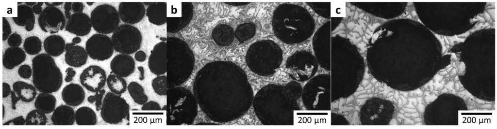 Representative microstructures of Mg AZ91D-Al2O3 syntactic foams containing hollow particles with diameters (a) 0.106–0.212 mm; (b) 0.212–0.425 mm and (c) 0.425–0.500 mm.