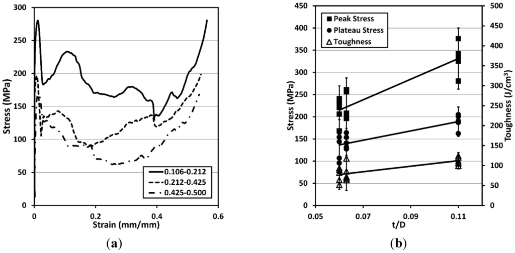 (a) Typical compressive stress–strain curves for Mg AZ91D-Al2O3 syntactic foams; (b) Peak strength (filled diamonds), plateau strength (filled squares) and toughness (open triangles) vs. t/D ratio. All properties shown increase with increasing t/D ratio. Error bars are shown (two standard deviations) based on the average value of each property.