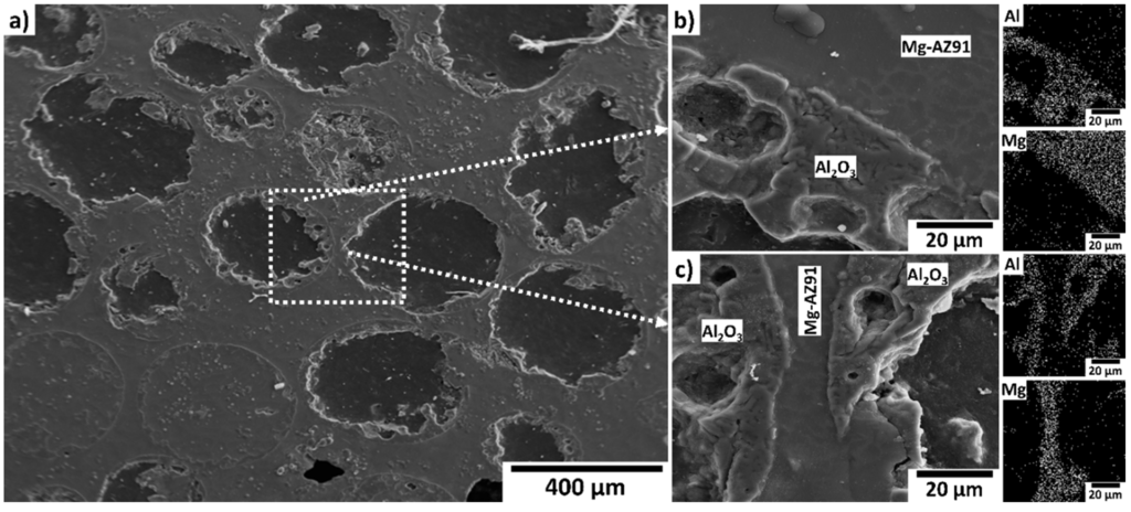 Figure 5 reveals that in many cases, the magnesium alloy has infiltrated pores in the walls of the hollow particles. The results of energy dispersive X-ray spectroscopy (EDS) (Advanced Analysis Technologies, Dane, WI, USA) dot mapping of aluminum (Al) and magnesium (Mg) in the magnified regions of