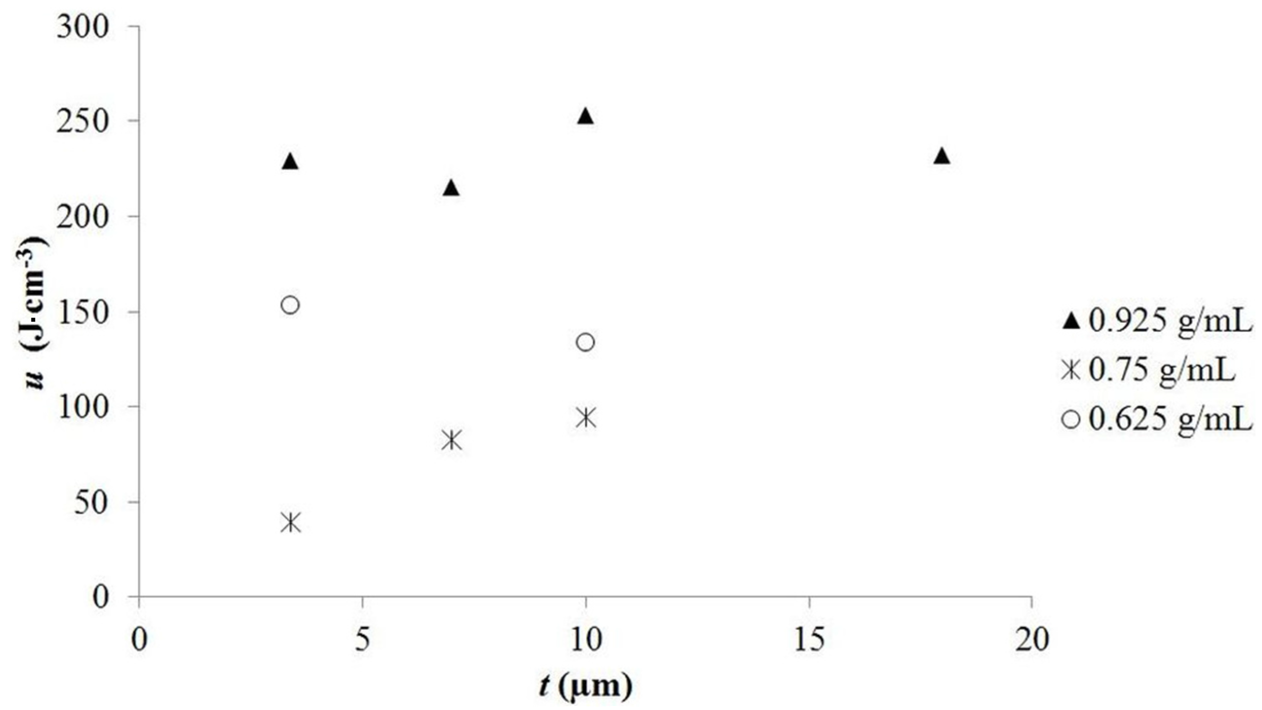 Energy density as a function of dielectric layer thickness. This figure shows that the energy density per dielectric volume in the “medium” voltage range is roughly independent of dielectric thickness, but is a non-linear function of salt concentration in the solution inside the tubes.