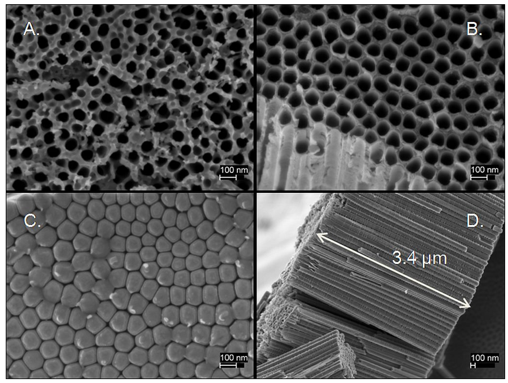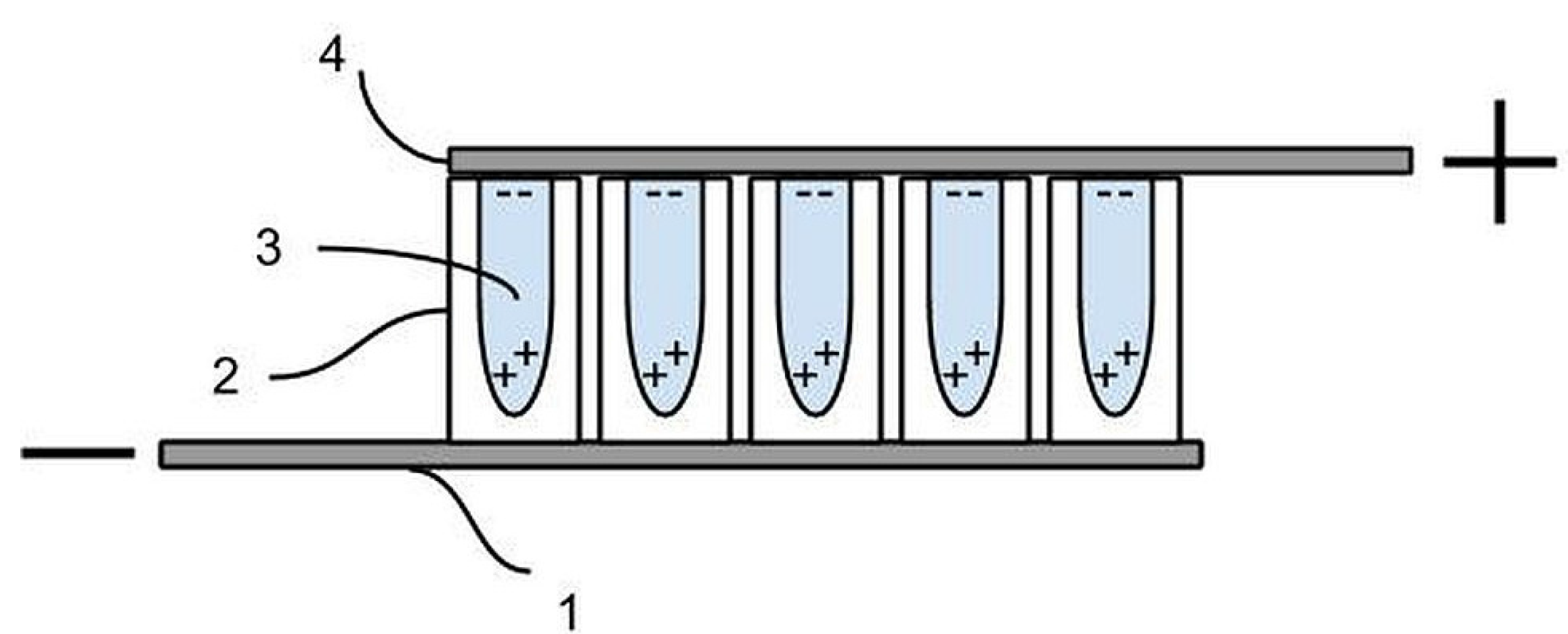 Another unique aspect of TSDM is the observed contrast with other aqueous dielectrics: the maximum operating voltage is not limited to the voltage at which ions are produced by the electrolytic decomposition of water. Finally, it needs to be emphasized that the oxide tubes are insulating the conducting electrodes (underlaying unanodized titanium on one side and graphite on the other) from one another, and the solution from one of the electrodes, eliminating the possibility of electron conduction and the occurrence of electrochemical reactions. Thus, this multi-material mixture is a dielectric material.