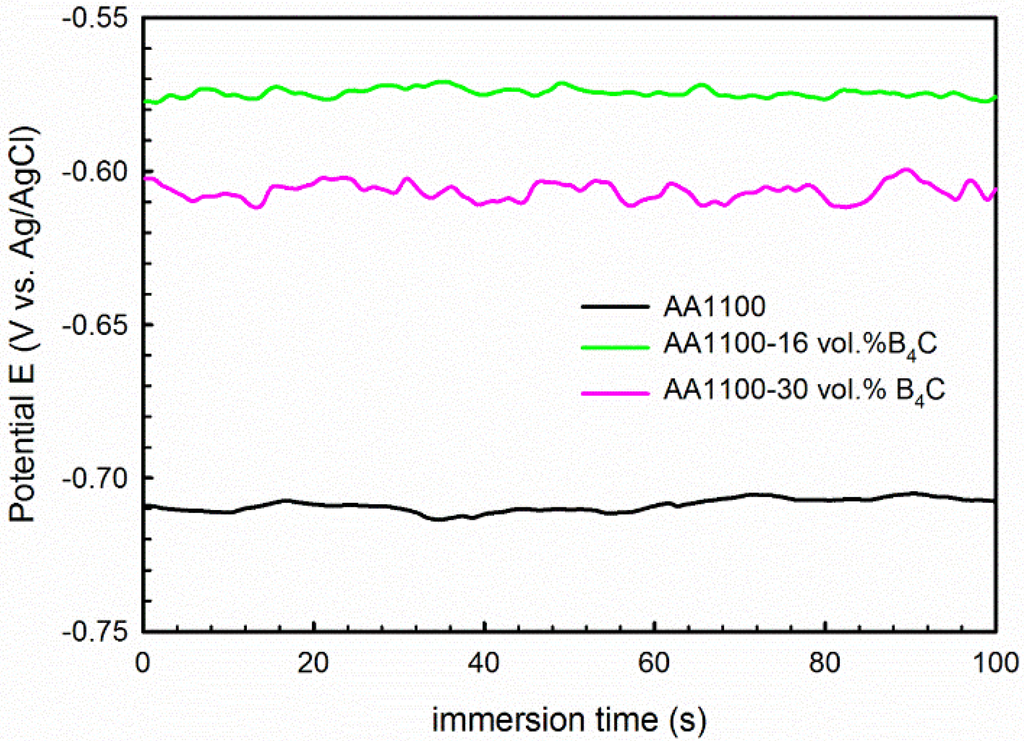 To further confirm the polarization results, EIS measurements were carried out for the composites and base alloy in 3.5 wt.% NaCl solution. Prior to the EIS measurement, the variation of Eocp as a function of time was measured and the graph is shown in Figure 4. It is observed that the Eocp is stabled at −710 ± 5 mV, −575 ± 3 mV and −607 ± 5 mV for AA1100, AA1100-16 vol.% B4C and AA1100-30 vol.% B4C, respectively.