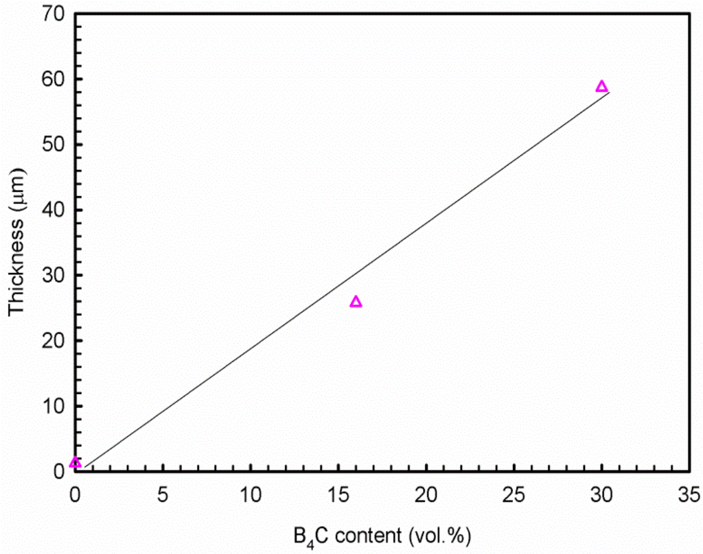 Relationship of corrosion product thickness and B4C volume fraction after 10 days exposure in 3.5 wt.% NaCl solution.