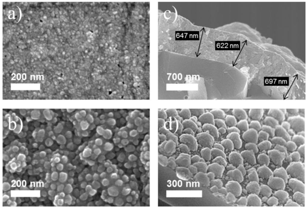 Surface morphologies of a flat-surface (a,c) and of a granular surface morphology film (b,d). Images (a) and (b) present top surface scanning electron microscopy (SEM) pictures of both kinds of films; images (c) and (d) display similar films after cleaving their substrates and after performing oblique-angle SEM on the cleaving edges.