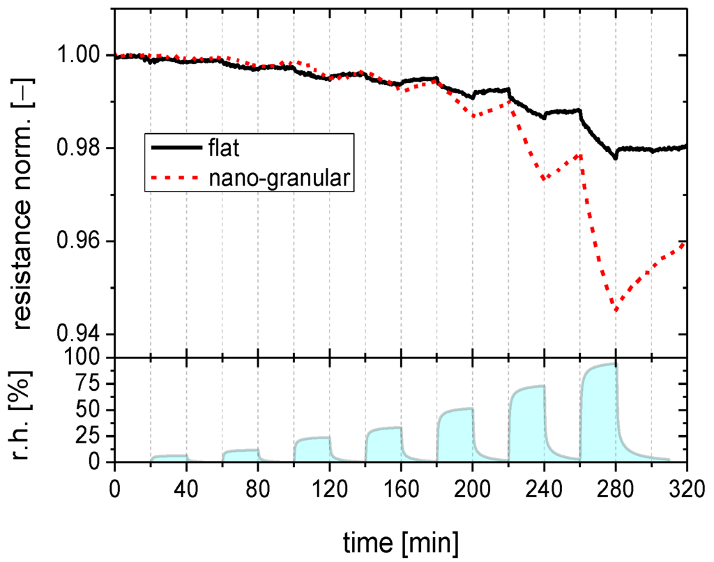 Before starting gas sensing tests, both kinds of sensing materials were heated and stored in a flow of dry synthetic air to remove any humidity that might have existed on the sensor surface. Thereafter the films were cooled to nominally room temperature and subjected to pulses of humidified synthetic air with the level of humidity increasing in each subsequent exposure pulse. Between each exposure pulse the initially dry flow of synthetic air was restored. The data displayed in Figure 2 show that SnO2, both in its flat-surface and nano-morphology versions, does respond to water vapor with the expected resistivity decrease. The magnitude and the dynamic behavior of the humidity responses, however, clearly depend on the surface morphology. The morphologies of the tested films are those shown in Figure 1a,b above.