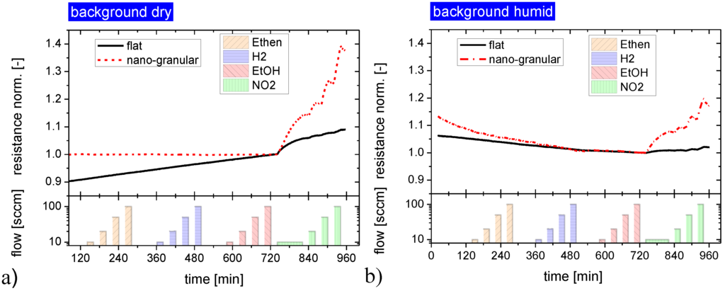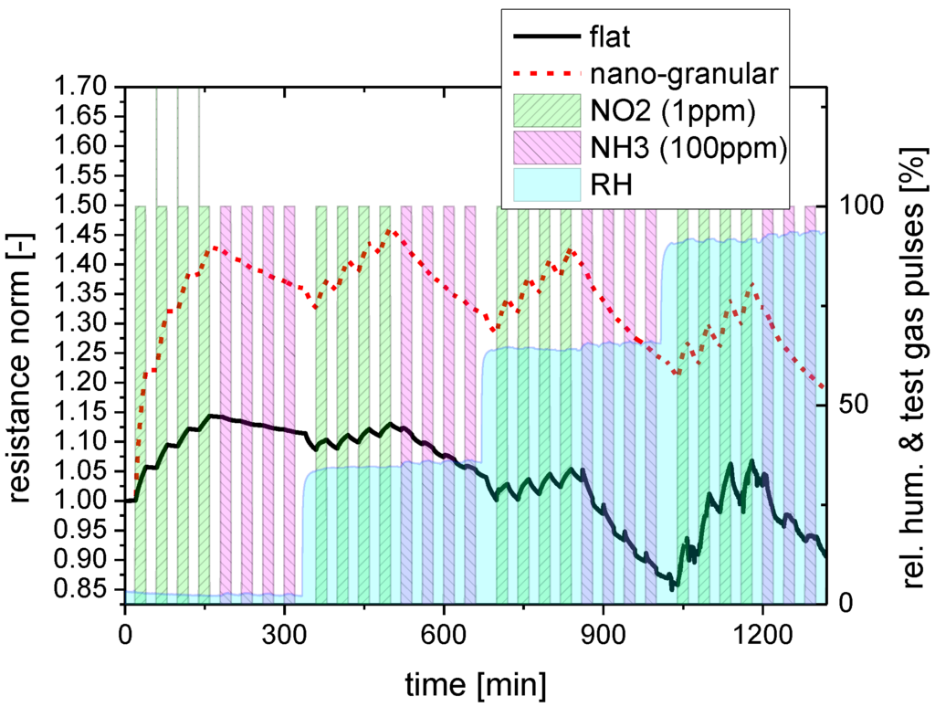 Both kinds of sensing materials were subjected to a series of NO2 and NH3 exposure steps to investigate their response towards water-soluble gases. In order to elucidate the effects of background humidity this experiment was repeated four times, each time increasing the humidity level of the synthetic air carrier gas from almost zero up to about 90% relative humidity. Figure 4 illustrates the timing of these exposure sequences in more detail, showing at the same time the reaction of the flat-surface and nano-granular SnO2 films to these exposure sequences. For better comparison, the sensor resistances of the two versions of SnO2 have been normalized to their starting values at the beginning of these sensing tests.