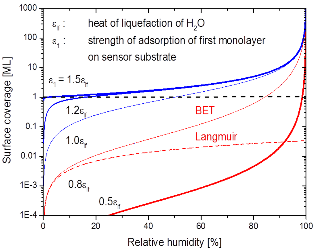 The two energy parameters in this latter equation, and , measure the strength of adsorption of the first monolayer directly on the substrate itself () and the strength of adsorption in each following monolayer of water molecules. Quantitatively, is the heat of liquefaction of bulk water ~ 0.445 eV per molecule) [46]. A numerical evaluation of the above equations demonstrates that the parameter plays a key role in enabling or disenabling BET multilayer absorption on a sensor surface. The data displayed in Figure 6 demonstrate that multilayer adsorption can readily occur when the binding of H2O molecules to the adsorbent surface is stronger than the binding between water molecules in liquid water ) and virtually impossible otherwise. Inspection of the above equations also shows that in the limit of low humidity ( < 0.1), BET isotherms are well approximated by the more familiar Langmuir isotherms: