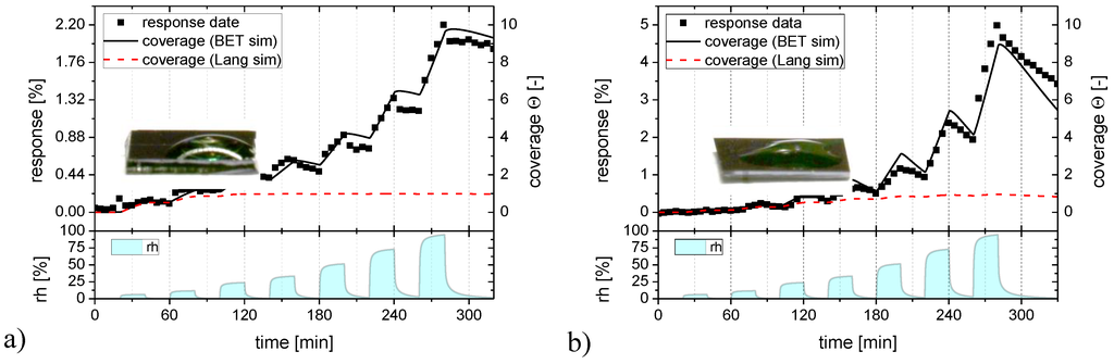 In order to fit the numerical models of adsorption according to Langmuir and BET kinetics, respectively, it is assumed that the gas response S of the MOx material is proportional to the number density of H2O molecules adsorbed on the surface: