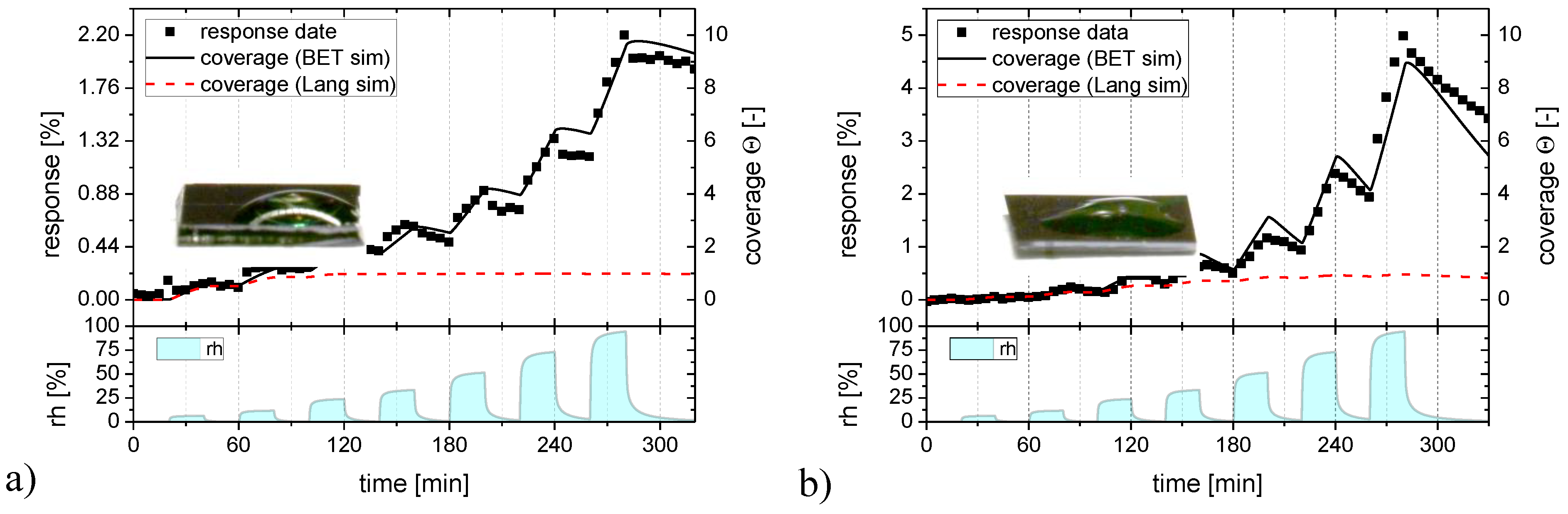 In Figure 7 the humidity response data of Figure 2 are reproduced as black solid squares and the Langmuir and BET fits as full colored lines. Turning to Figure 7a first, it is seen that a Langmuir adsorption process (red line) can well approximate the low humidity part of the flat-surface sensor data but that it fails to do so at the higher humidity levels. A BET process (black line) obviously provides a much better fit over the whole range of humidity levels. We can take this as evidence that SnO2 surfaces are reasonably hydrophilic and that therefore BET multilayer adsorbates do indeed form. Supporting evidence into this direction is provided by the fact that the contact angle of water is small on the investigated sensor surfaces (insets in Figure 7) and from the theoretical results of Figure 6, which show that monolayer adsorbates should already arise at extremely low levels of humidity when the H2O binding on the adsorbent surface is stronger than the hydrogen-bridge bonding in liquid water. Figure 7b repeats the humidity response data of Figure 2 for the granular morphology layers, plotting at the same time the corresponding Langmuir and BET fits. Again, a BET process provides a much better fit over the entire range of humidities than a Langmuir one.