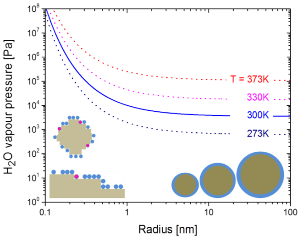 Theoretically, desorption enhancements of H2O on nano-structured surfaces are expected on the basis of the Kelvin equation [49,50,51]: