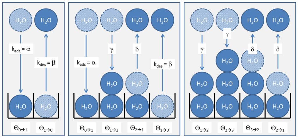 In a dynamic situation, as in our humidity sensing tests, the numbers of molecules in each site change via adsorption and desorption processes via interactions with H2O molecules in the gas phase. In each of these processes, an adsorption site initially in the coverage fraction either changes into fraction or fraction , respectively. These exchange processes are visualized in Figure A1 for the three cases of zero, one and two layers already adsorbed.