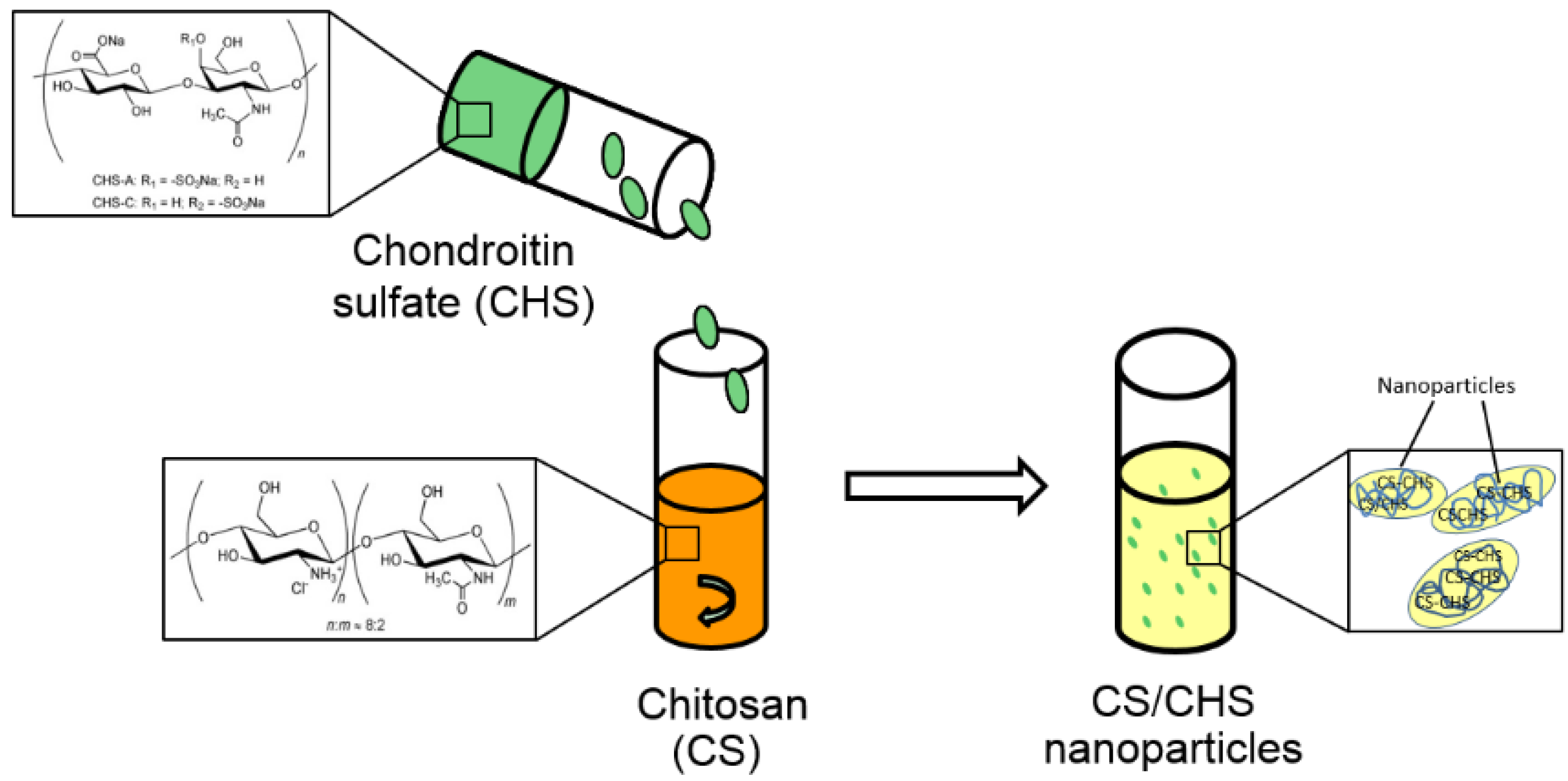 Representative scheme of the formation of CS/CHS nanoparticles by polyelectrolyte complexation.