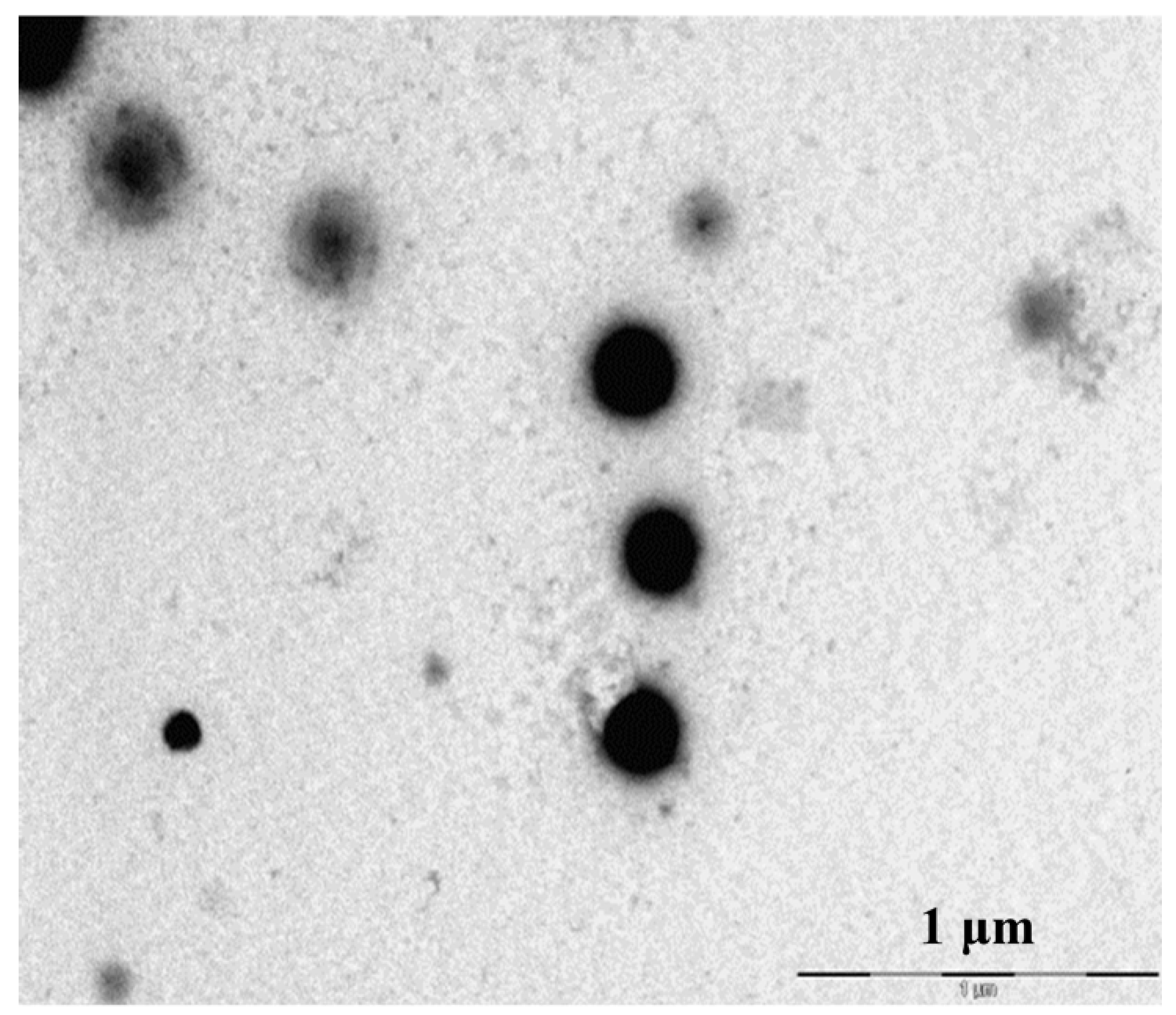 Upon mixing the two polysaccharides in the referred range of mass ratios, a clear Tyndall effect was observed in all cases, indicating the formation of colloidal structures. As observed in the transmission electron microphotograph displayed in Figure 2, the morphology of CS/CHS nanoparticles corresponds to a compact structure with tendency to exhibit spherical shape, as has been described for many formulations of polysaccharide-based nanoparticles prepared by polyelectrolyte complexation [11,37,38,39,40].