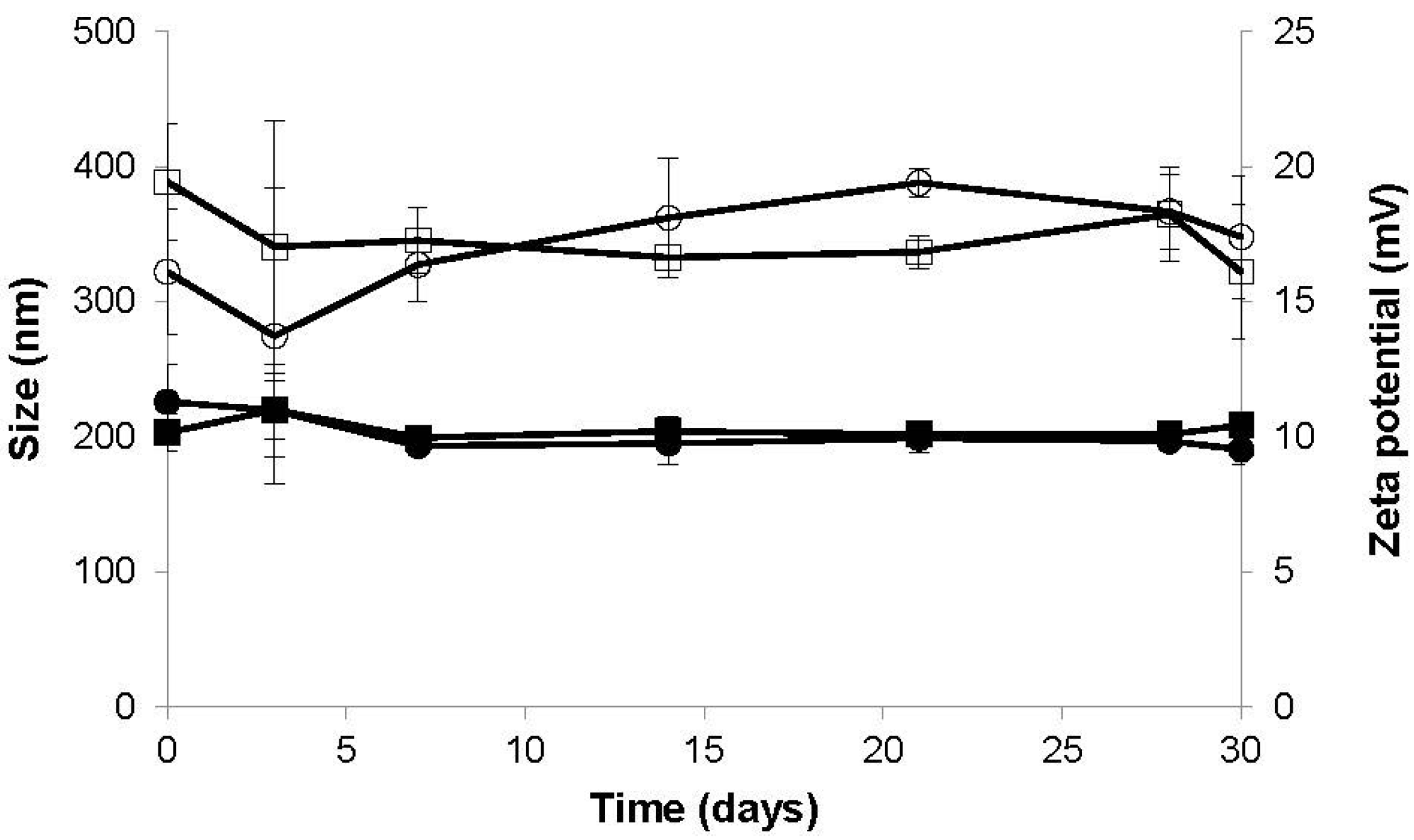 Evolution of the size (dark symbols) and zeta potential (empty symbols) of CS/CHS = 3/1 (circles) and CS/CHS = 4/1 (squares) nanoparticles as a function of time, upon storage of the aqueous suspension of nanoparticles at 4 °C (mean ± SD, n = 3).