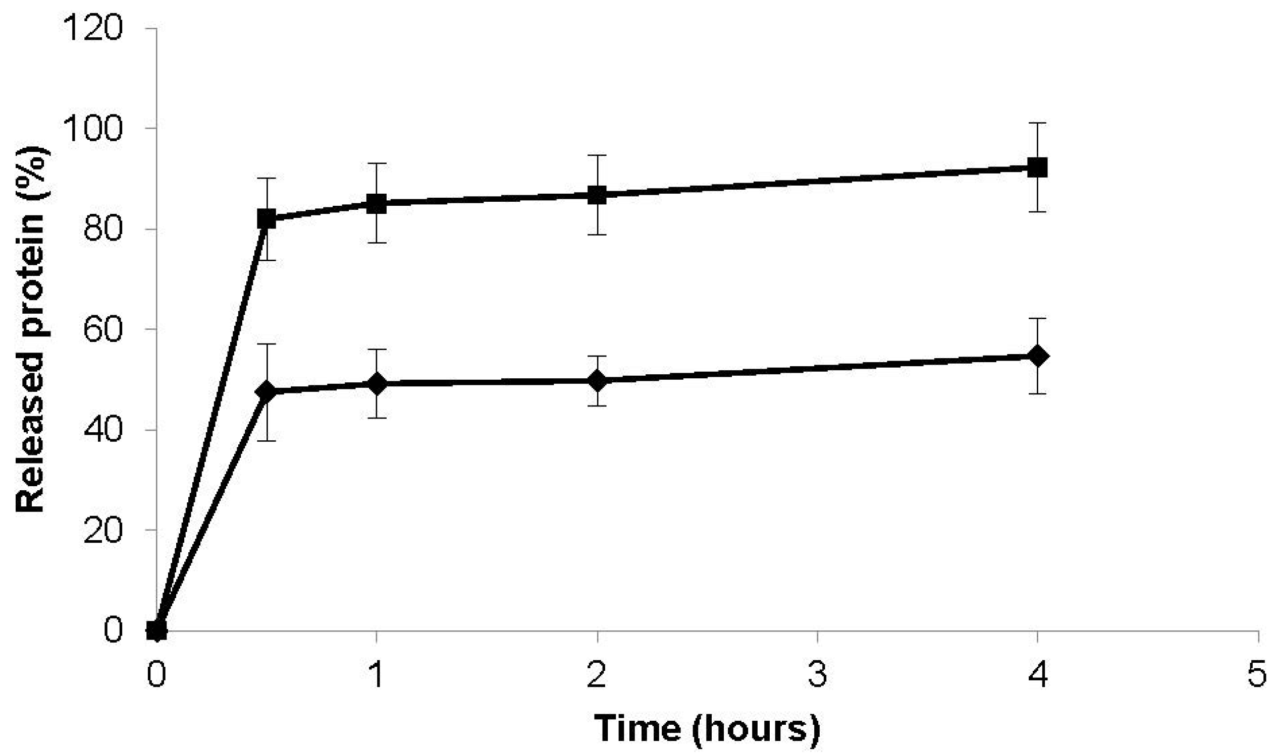 The release of the proteins was determined by incubating a predetermined amount of the nanoparticles (CS/CHS = 3/1, w/w) in 12 mL of PBS pH 7.4 with horizontal shaking at 37 °C. At appropriate time intervals (0.5, 1, 2, and 4 h), individual samples were collected and filtered (0.22 µm filters Millex®-GV, low protein binding, Millipore, Madrid, Spain) and the amount of protein released evaluated in the supernatants by spectrophotometry, as described above, for each protein (n = 3).