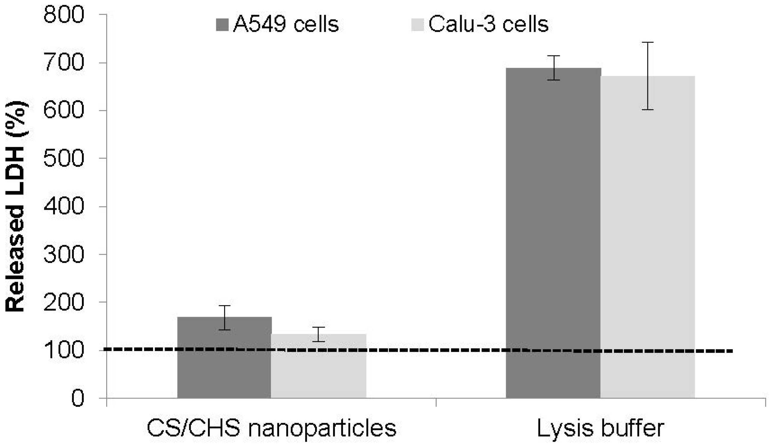Effect of CS/CHS nanoparticles (CS/CHS = 3/1 (w/w), 1 mg/mL) on LDH release from Calu-3 and A549 cells upon 24 h exposure. Data represent mean ± SEM (n = 3, six replicates per experiment). Dotted line (100% LDH) represents the result of incubation with cell culture medium, used as control.