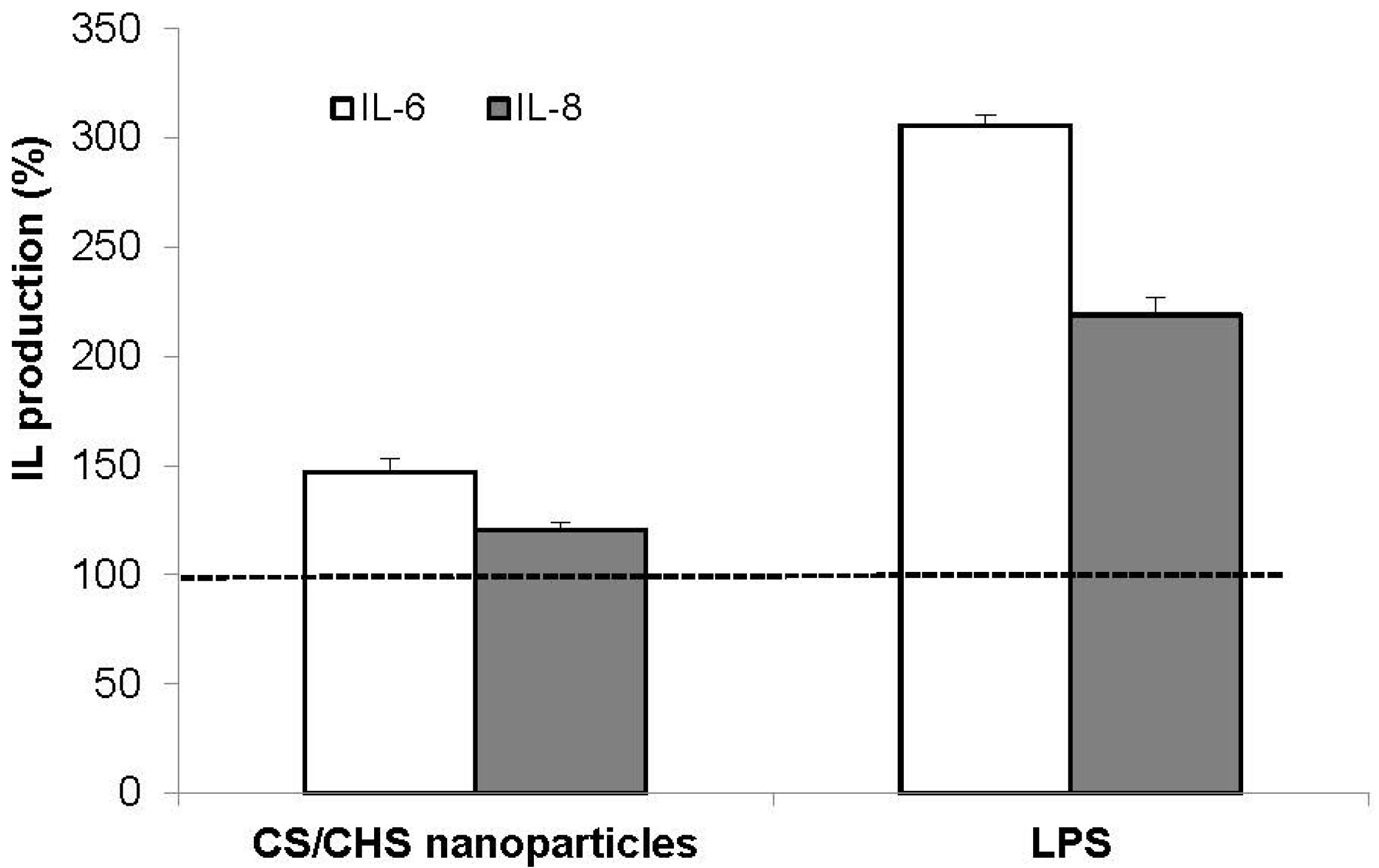 IL-6 and IL-8 secretion by Calu-3 cells exposed for 24 h to CS/CHS nanoparticles (CS/CHS = 3/1 (w/w), 1 mg/mL) and lipopolysaccharide (LPS, 10 μg/mL). Data represent mean ± SEM (n = 3). Dotted line (100% IL production) represents the result of incubation with cell culture medium, used as control.