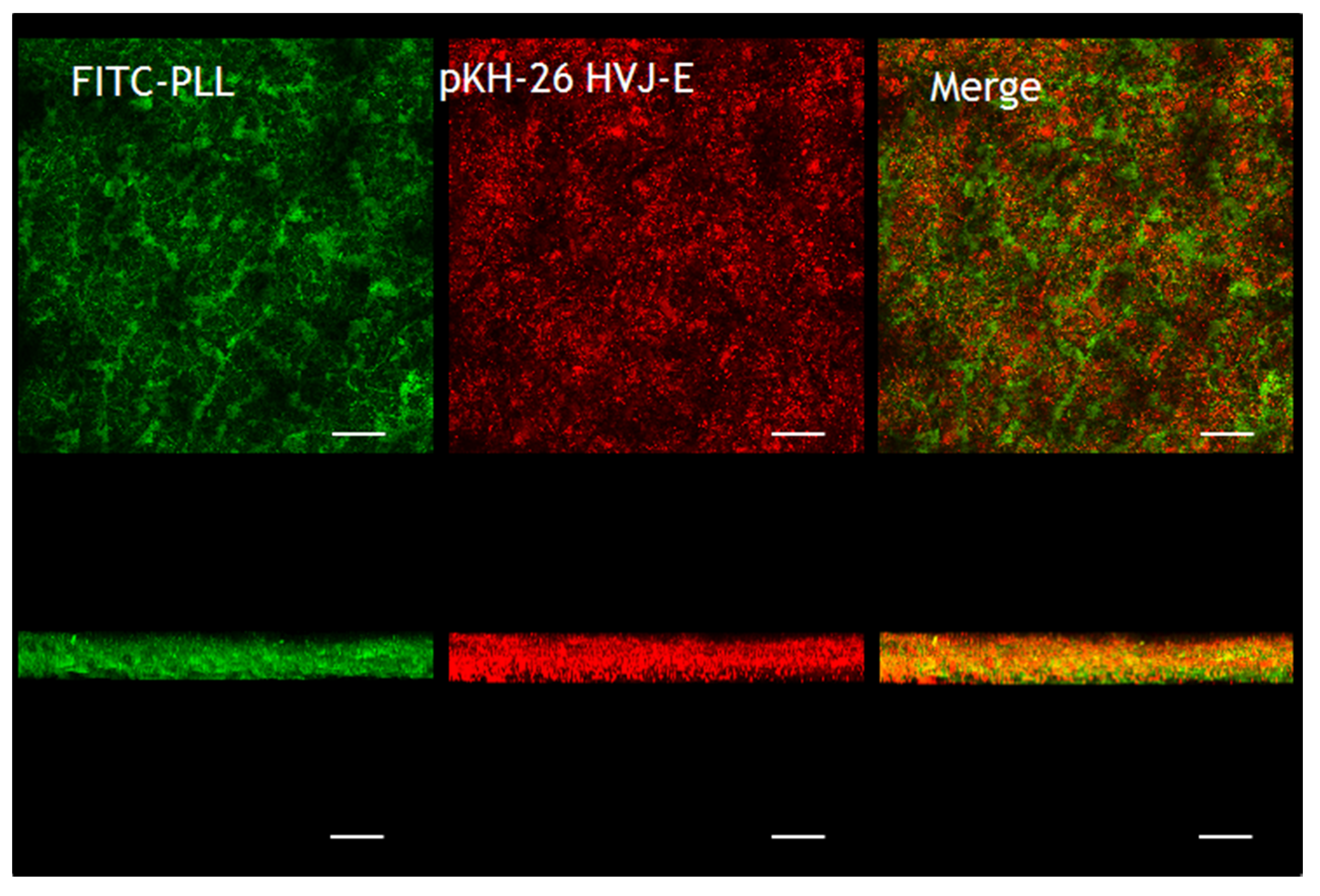 - Okada, T.; Uto, K.; Sasai, M.; Lee, C.M.; Ebara, M.; Aoyagi, T. Nano-decoration of the hemagglutinating virus of Japan Envelope (HVJ-E) using a Layer-by-Layer assembly technique. Langmuir 2013, 7384–7392. [Google Scholar] [CrossRef] [PubMed]