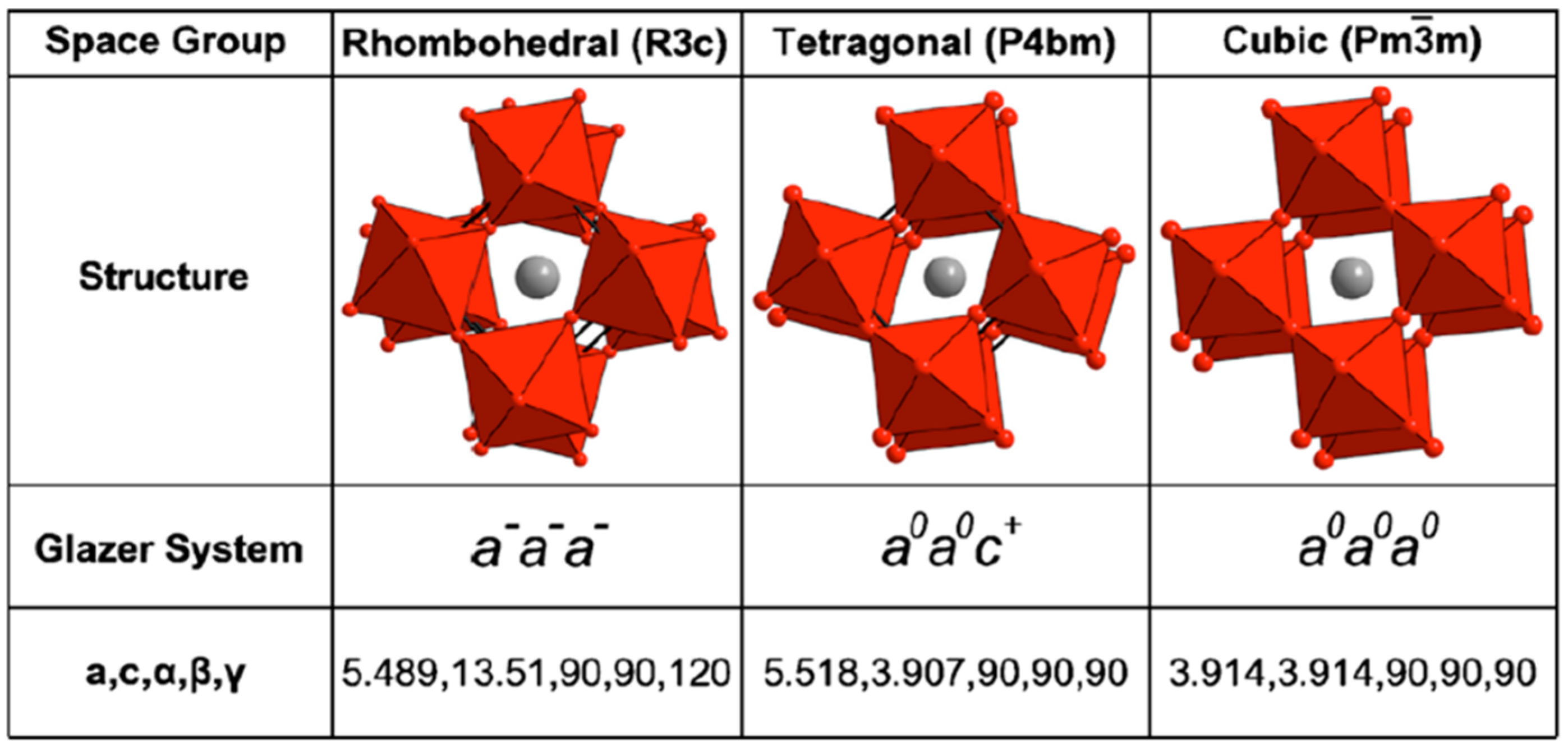 Structural properties of the rhombohedral R3c, tetragonal P4bm, and cubic Pm-3m phases reported for Bi0.5Na0.5TiO3 (BNT). The lattice parameters for the rhombohedral case are given in the hexagonal system. Reproduced with permission from [5].