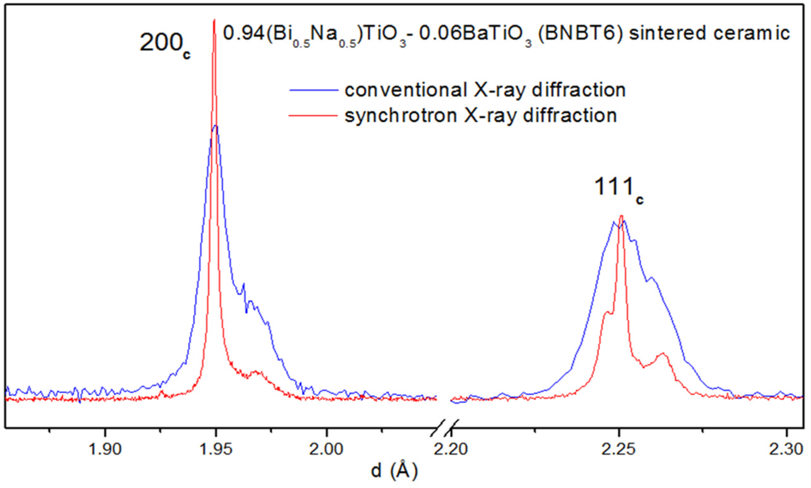 Diffraction peaks from sintered BNBT6 bulk ceramic from a powder flat specimen measured using a conventional Cu-cathode X-ray tube (step 0.05 2θ° and 5 s counting time) and synchrotron radiation at MCX beamline Elettra Sincrotrone, Trieste (Italy) (step 0.005 2θ° and 2 s counting time).