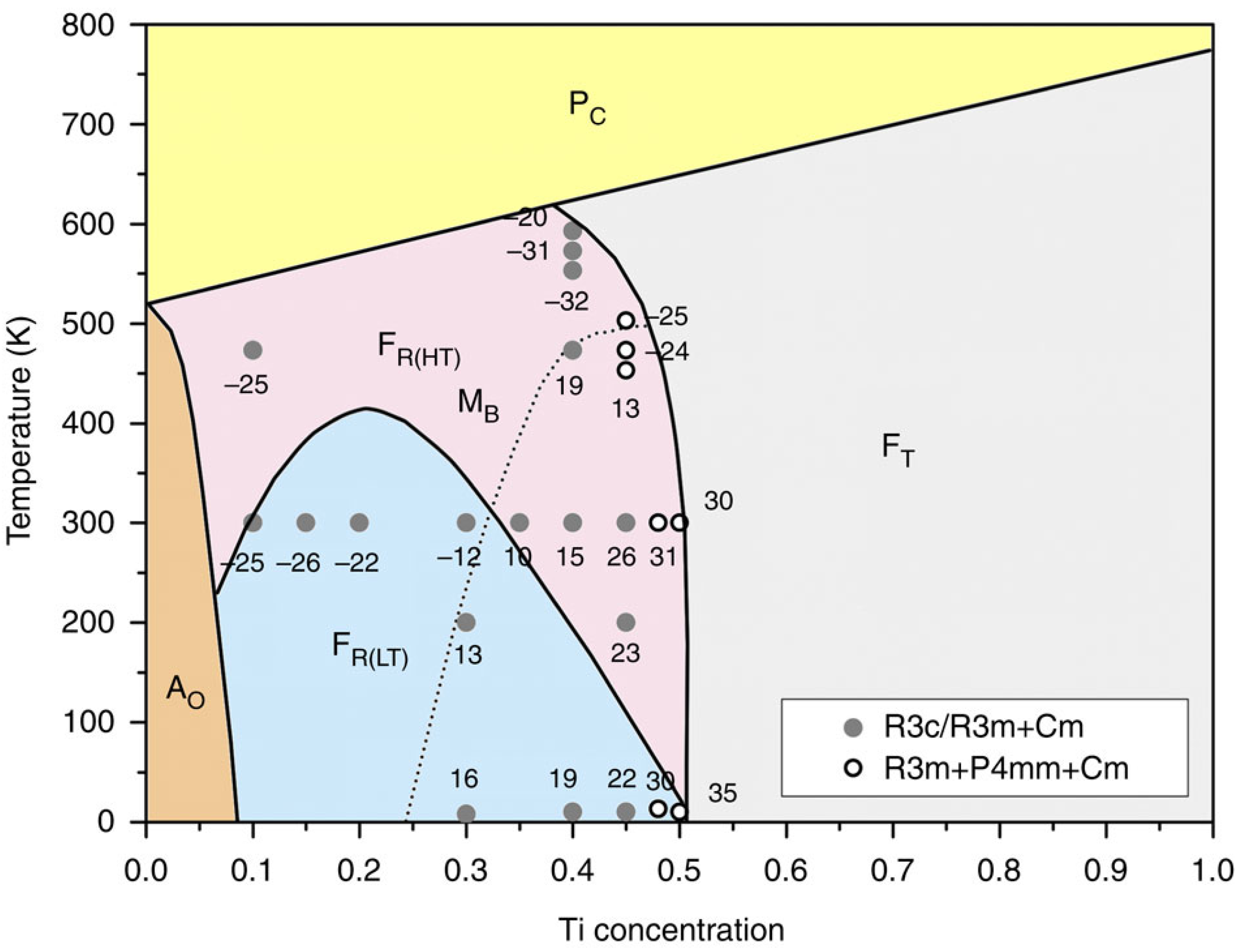 Zhang, et al.’s phase diagram for PZT: The crossover between MB and MA structures is marked by a dashed line. The numbers close to the full and hollow small circles represent the deviation angle (in degrees) of the Pb cations shifts, relative to the rhombohedral case. Reprinted with permission from [12].