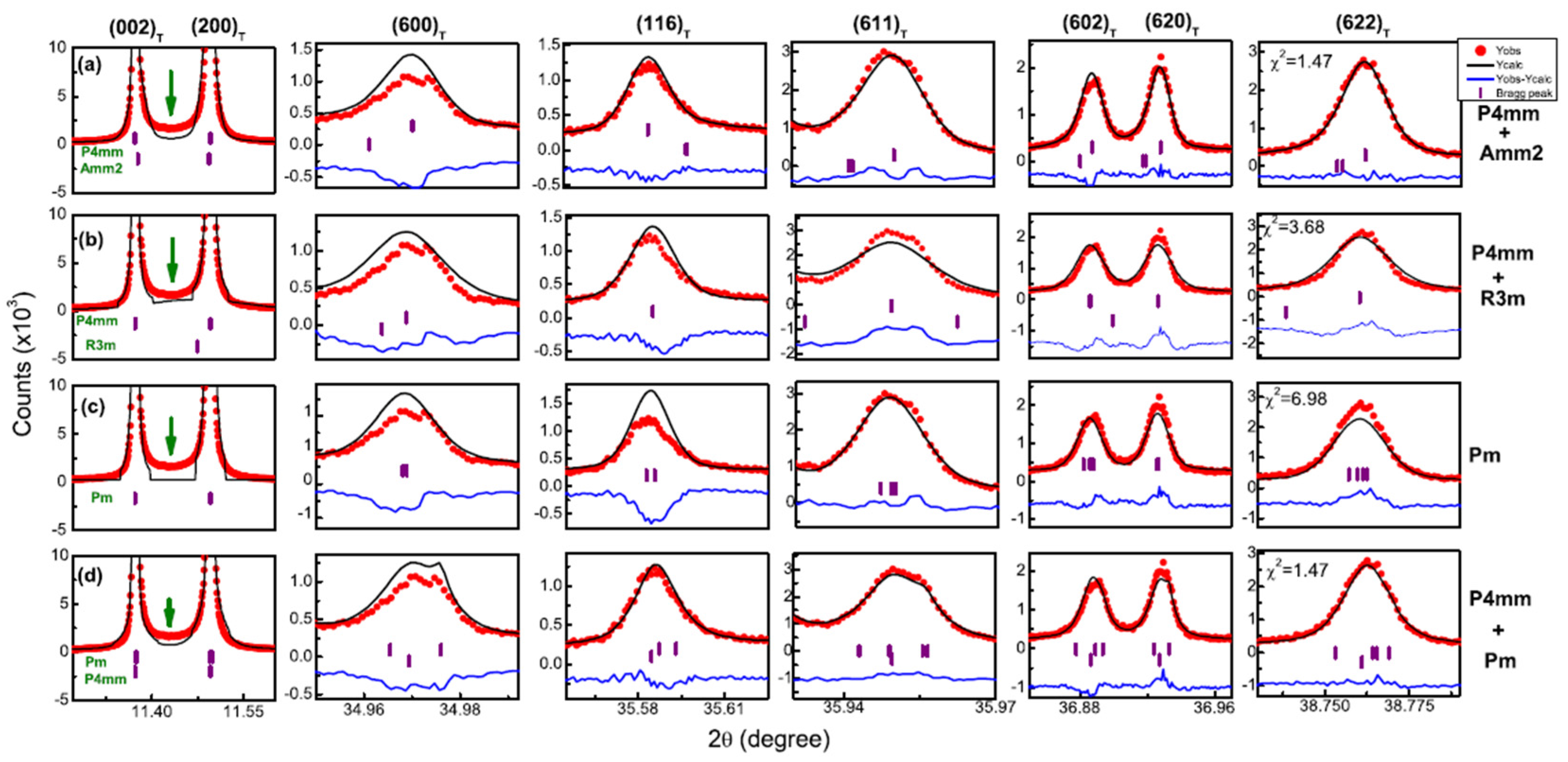 Rietveld fitted synchrotron high-resolution XRD profiles of BaTiO3 with models (a) P4mm + Amm2, (b) P4mm + R3m, (c) Pm, and (d) P4mm + Pm. Best fitting model is P4mm + Pm. Reproduced with permission from [32].