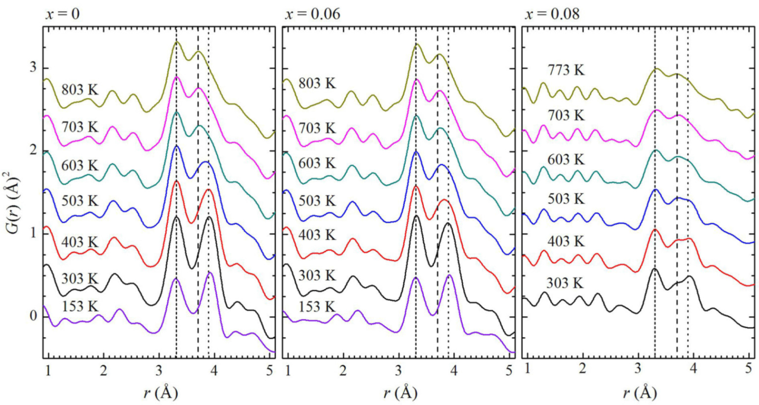Temperature-dependent X-ray PDF patterns of BNBT for x = 0, 0.06, and 0.08. The short-dashed lines (3.3 Å) mark the feature corresponding to A-B distances; the dashed (3.7 Å) and dotted lines (3.9 Å) mark the two components in the feature related to A-A and B-B distances. Reproduced with permission from [39].