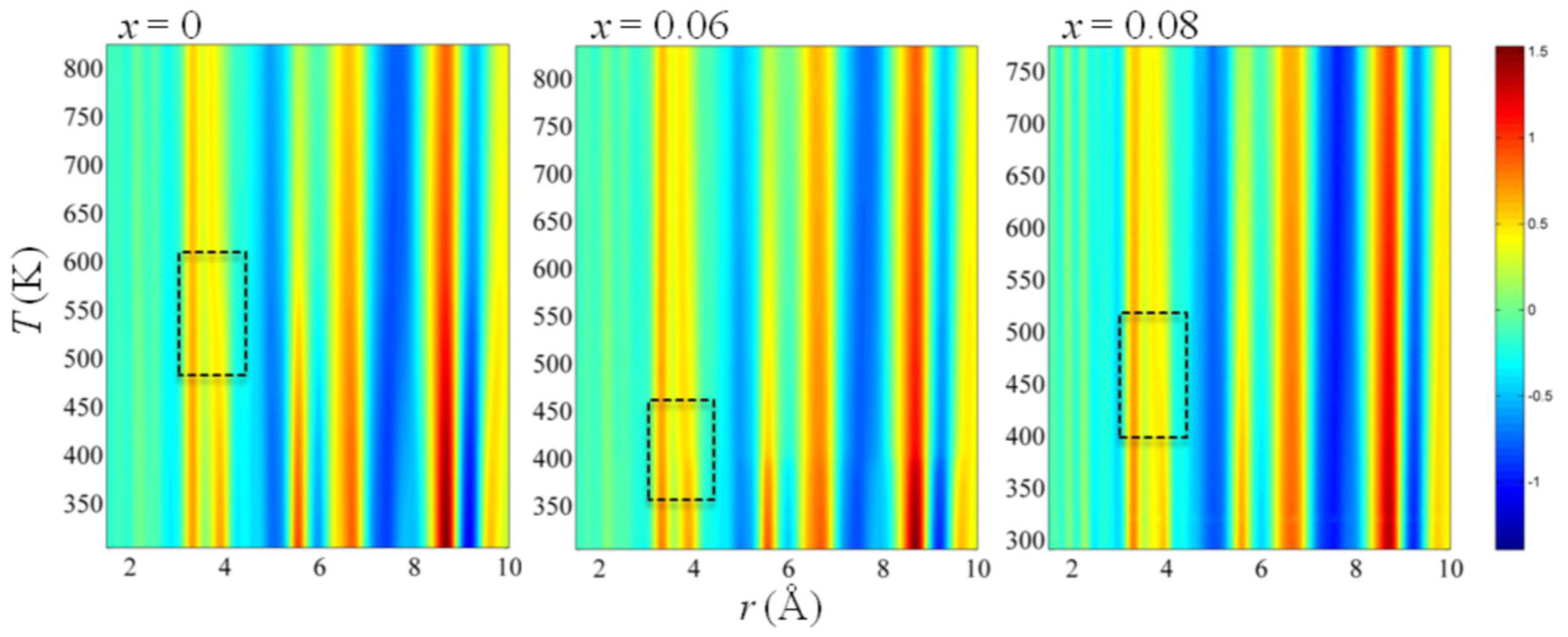 Temperature evolution of X-ray PDF intensities for BNBT for x = 0, 0.06, and 0.08; the dashed rectangles mark the temperature ranges of the most pronounced changes in PDFs. Reproduced with permission from [39].