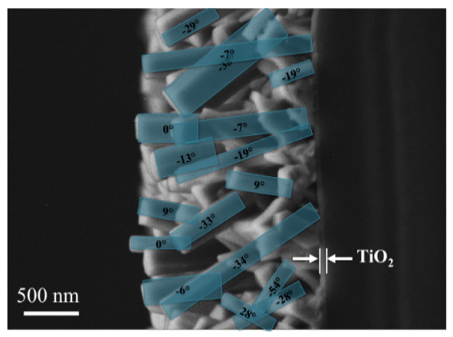 SEM micrograph of textured ZnO thin layer on TiO2/borosilicate glass. Cross section view. Image exhibits several ZnO nanorods and their axis inclination from substrate normal. Reproduced with permission from [53].