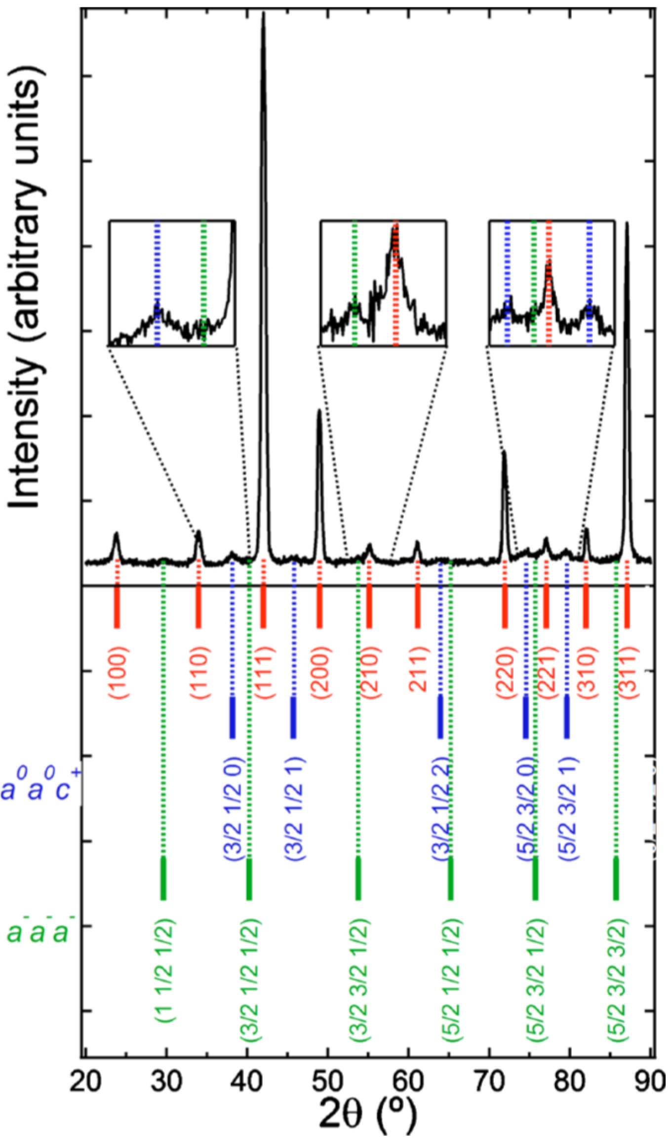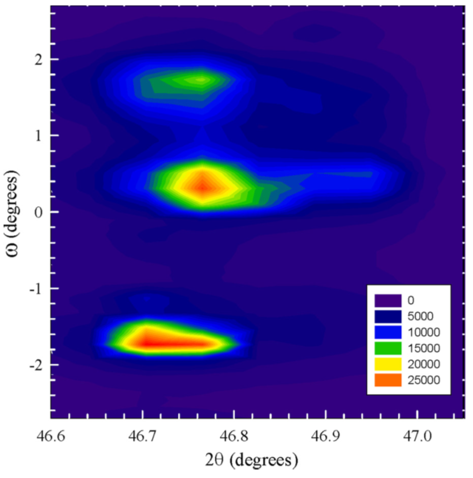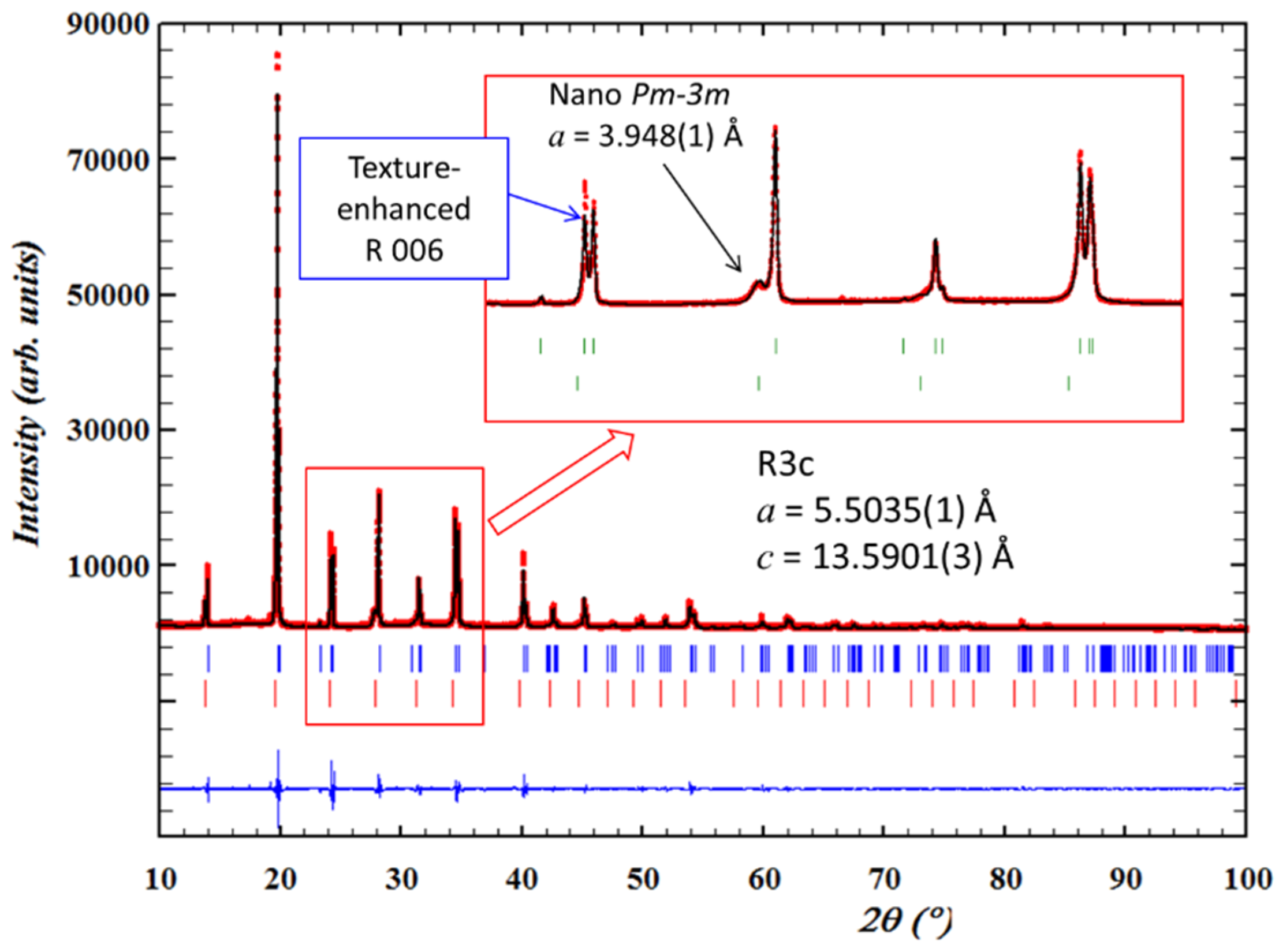 Figure 11 shows the synchrotron-measured reciprocal space mapping of the considered peak cluster. The two signals from the T phase and the one from the R component are now clearly displayed by the three contour centers in the two-dimensional reciprocal domain. According to Chen and collaborators, the broad reflections in R and T mapping contours imply nanostructures, which are often expected in relaxor ferroelectric and ferroelastic crystals to accommodate the lattice distortions of different structures. Since nanostructures are usually smaller than the coherent length of X-ray radiation, diffracted waves from individual nanostructures can coherently superimpose and thus broaden the diffraction peaks.