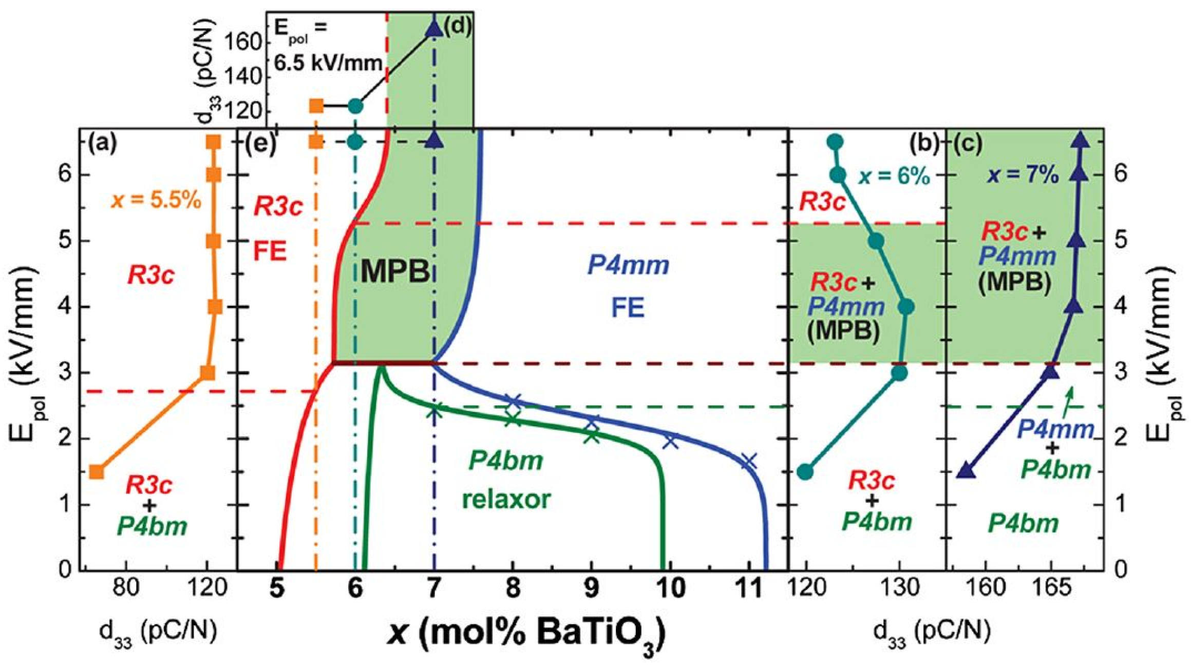 - Ma, C.; Guo, H.; Beckman, S.P.; Tan, X. Creation and destruction of morphotropic phase boundaries through electrical poling: A case study of lead-free (Bi1/2Na1/2)TiO3–BaTiO3 Piezoelectrics. Phys. Rev. Lett. 2012, 109. [Google Scholar] [CrossRef] [PubMed]