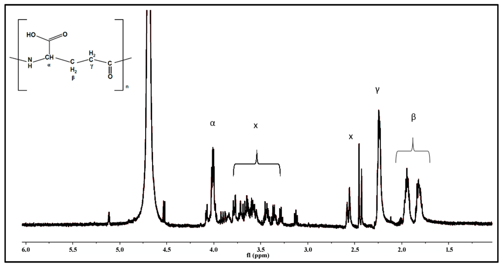 Also the 1H-NMR spectrum (Figure 2) confirms the sole presence of γ-PGA in the synthesized samples. X indicates impurity peaks and the extraordinary high peak is the Deuterium Oxide (D2O) used as a solvent. The number average molecular mass (Mn) analyzed by GPC was 482,000 and dispersity was 1.3.