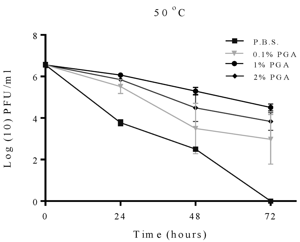 The survival rate of formulated and non-formulated phage was evaluated via a series of time course experiments at different temperatures. The effect of γ-PGA concentration on the viability of formulated phage was initially studied at 50 °C. The results obtained show an increase in viability at all incubation time with increasing concentration of γ-PGA (Figure 3). The difference in viability between 1% and 2% is however significant but with little biological relevance (P ≤ 0.05). Thus, 1% γ-PGA formulation was used in subsequent experiment.