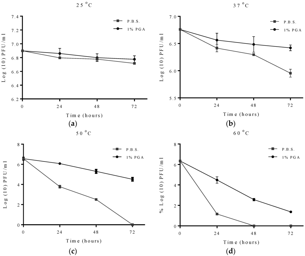 Poly-γ-glutamic acid (γ-PGA) is a biodegradable, biocompatible and non-toxic polymer. These characteristics make it a particularly attractive polymer for a wide range of potential applications in the biomedical and environmental industries. Their solubility in water is also a characteristic that makes it well suited for these applications compared to other polymers that are soluble only in organic solvents, some of which may have harmful environmental and biological implications. The ability of γ-PGA to protect and effectively deliver a wide range of drugs to their target site has been studied extensively [1,25,26]. In addition, the polymer has been used in the protection and delivery of genetic materials and vaccines [1]. Recently, γ-PGA was shown to effectively protect probiotic bacteria from the effect of harsh environmental conditions for effective storage and enhanced delivery to their host [9]. However, the use of these polymers to protect active phage particles from harsh environmental conditions has previously not been studied.