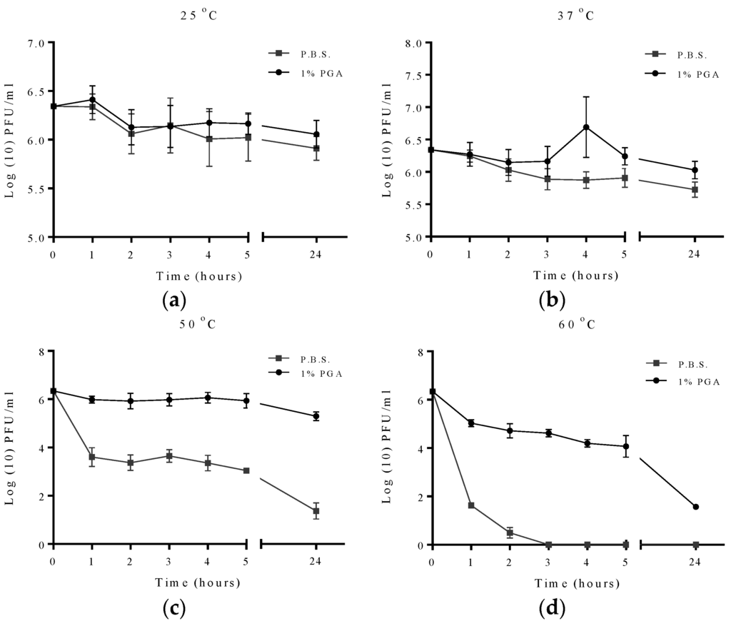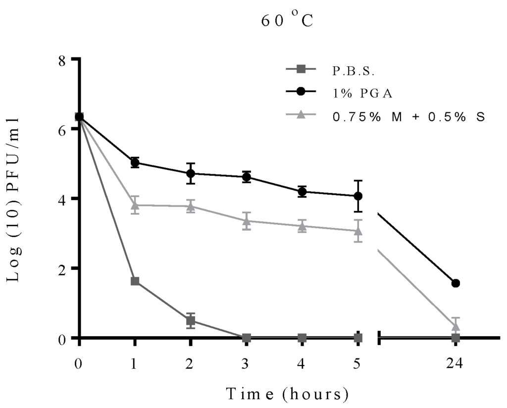 In order to investigate which formulation had the better protective effect, a comparison between T2 phage formulated with γ-PGA or with 0.75% skimmed milk and 0.5% sucrose as described previously [24] was conducted. Both formulations were exposed to 60 °C for 24 h (Figure 6). The viability of formulated phage with γ-PGA was greater than the non-γ-PGA formulation as phages formulated with γ-PGA showing 1.5 log unit of viability, while the milk formulated phage was almost inactivated after 24 h of exposure.