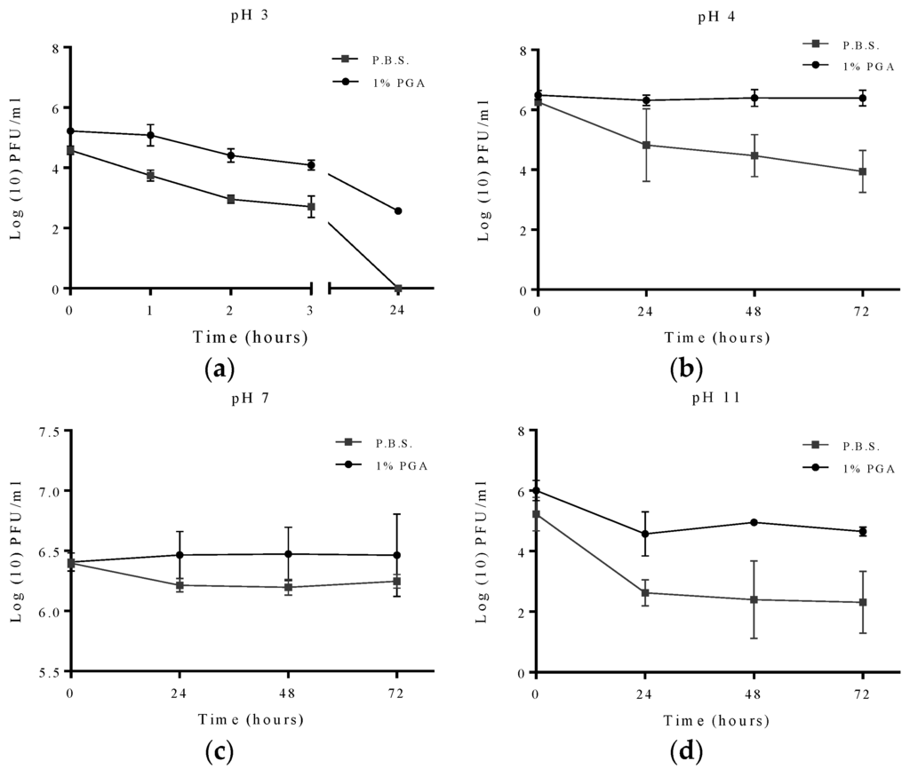 The protective effect of γ-PGA on T2 phage at different pH solutions. Experimental points measured at 0, 24, 48 and 72 h, and conducted in quadruplicate (n = 4). Readings from the pH 3 experiment were measured at 0, 1, 2, 3 and 24 h. Error bars represent the standard error of the mean. Formulated and non-formulated T2 phage exposed to solution of (a) pH 3; (b) pH 4; (c) pH 7; (d) pH 11.