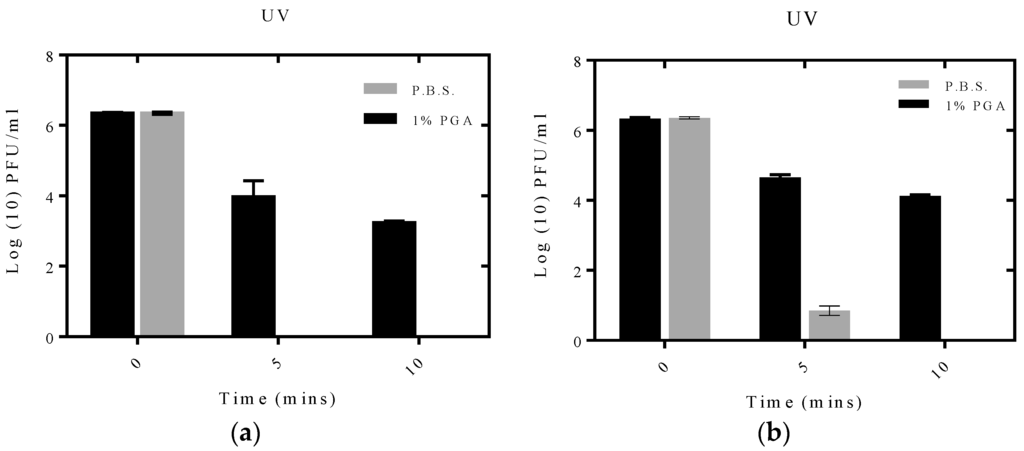 Effect of UV irradiation on formulated on non-formulated phage population: (a) Protective effect of γ-PGA on T2 phage; (b) Protective effect of γ-PGA on MS2 phage. Readings were measured at 0, 5 and 10 min, at a wave length of 245 nm. All experiments were conducted in quadruplicate (n = 4). Error bars represent the standard error of the mean.