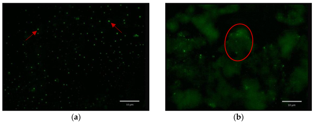 In order to investigate the interaction between the phage and γ-PGA, T2 in PBS and formulated T2 was stained with 2.5% (v/v) SYBR green I and examined under high magnification using fluorescence microscopy. Non-formulated phage (T2 in PBS were well dispersed represented by well-spaced bright particles. In contrast, the formulated phage were associated with γ-PGA (Figure 9), as formulated phages are seen to aggregate in characteristic clumps within and around γ-PGA.