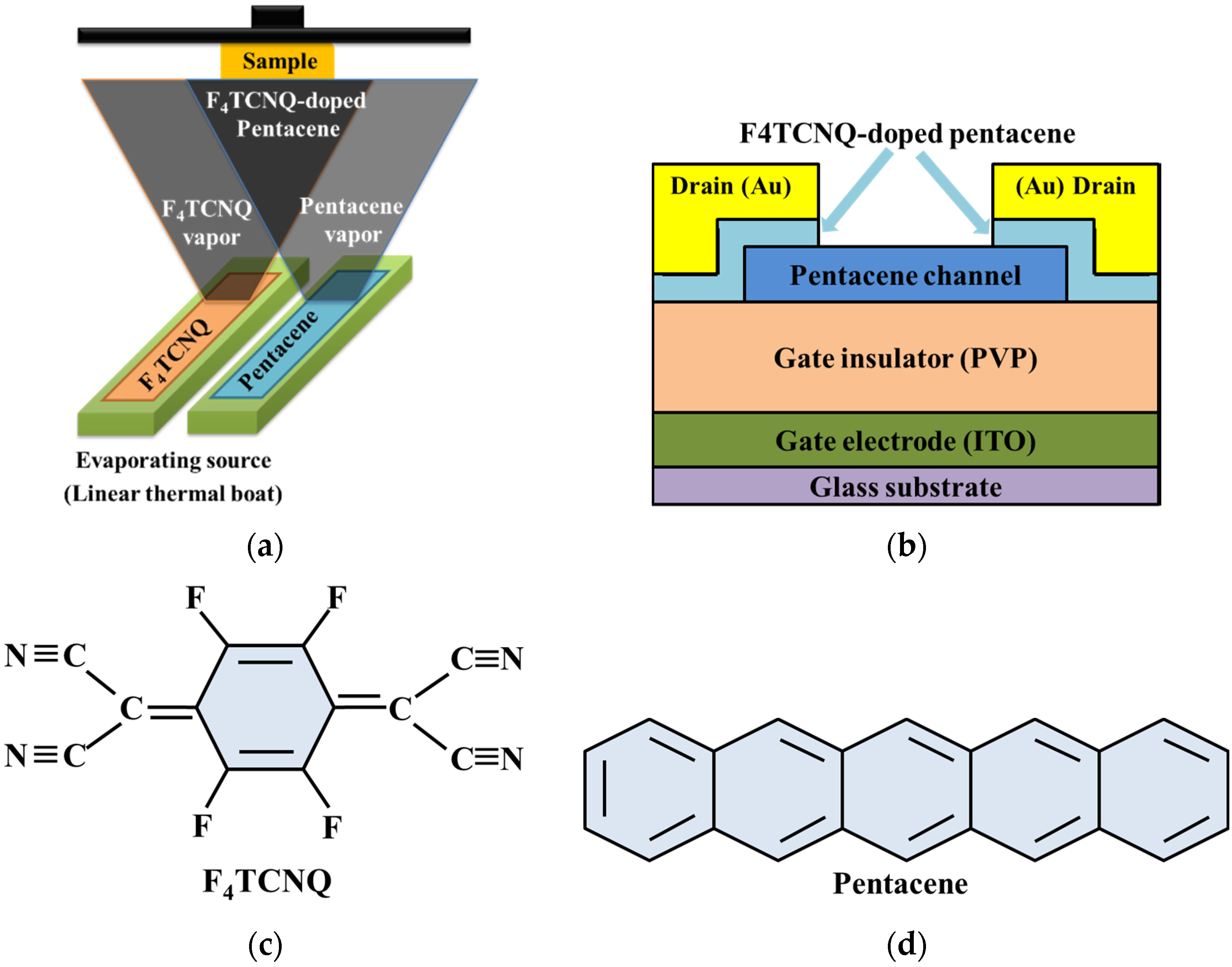 (a) a schematic diagram of the co-evaporation process; (b) a schematic structure of the pentacene-based organic thin-film transistors (OTFTs) with F4TCNQ-doped pentacene injection layer, and the molecular structures of (c) F4TCNQ and (d) pentacene, respectively.