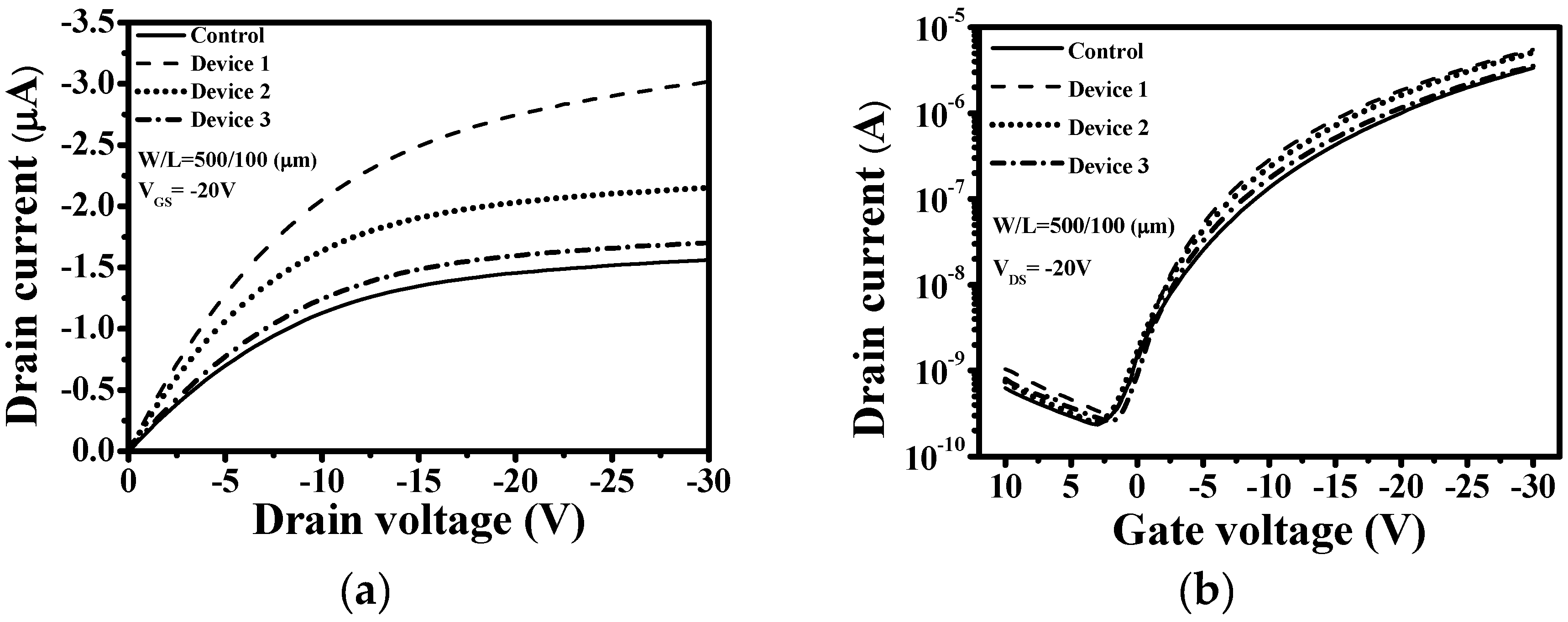 Figure 2a shows the output characteristics (IDS-VDS) of the devices with different F4TCNQ:pentacene ratios for a VGS = −20 V. The saturation current of Device 1 was −3.02 × 10−6 A for VDS and VGS values of −30 and −20 V, respectively; this saturation current was much higher than those of Devices 2 and 3 and the control sample. The IDS value of Device 1 was approximately 193% higher than that of the control sample. Figure 2b shows the transfer characteristics (IDS-VGS) of the devices with different F4TCNQ:pentacene ratios. The μFE value of Device 1 was enhanced by a factor of 1.6 and the on/off current ratio was enhanced by a factor of 1.5 compared with the control sample. This appreciable improvement in the electrical performance of Device 1 could be attributed to the F4TCNQ:pentacene ratio being appropriate and to the charge density at interface between the S/D electrodes and the pentacene channel being high, improving charge injection [12,16]. However, the μFE value of the devices decreased with a decrease in the F4TCNQ concentration of the F4TCNQ-doped pentacene interlayer.