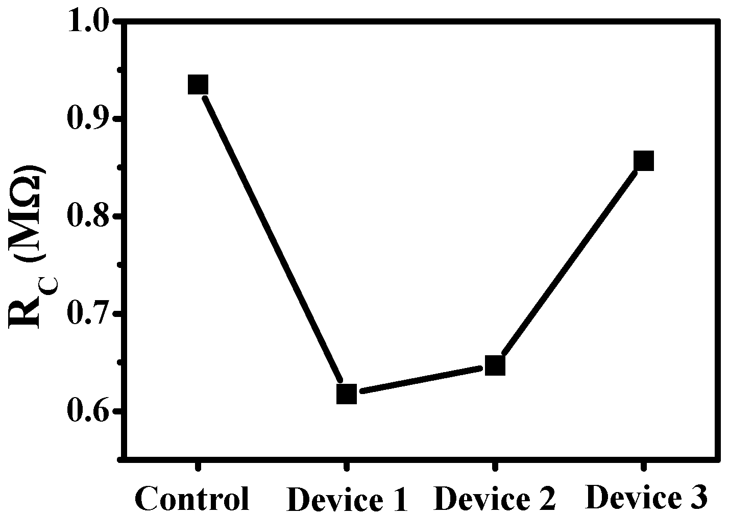 To quantitate the effect of the F4TCNQ:pentacene ratio of the F4TCNQ-doped pentacene interlayer on the electrical contact between the pentacene channel layer and the S/D metal electrodes, the channel length dependence of the total resistance (RTotal) was determined according to the linear regions of the output characteristics of the fabricated devices. The channel lengths were 100, 150, 200 and 250 μm. The RC value was obtained from the transmission line model (TLM) by extrapolating the RTotal curve to obtain the y-intercept for zero channel length [17]. The RC values of the four devices, determined from the TLM, are shown in Figure 3. The RC value of Device 1 at a gate voltage of −20 V was 0.617 × 106 Ω, which is approximately 1.5 times lower than that of the control sample (0.935 × 106 Ω). As shown in Figure 3, RC first decreases and then increases with a decrease in the F4TCNQ concentration of the F4TCNQ-doped pentacene interlayer. Apparently, the F4TCNQ concentration affects hole transport across the interface between the S/D metal electrodes and the pentacene channel layer. In the presence of an F4TCNQ-doped pentacene interlayer, the hole carrier could easily move through the F4TCNQ-doped pentacene layer into the pentacene channel because of the improvement in the local conductivity and the formation of a multiple step barrier at the interlayer [12,16]. F4TCNQ is an acceptor dopant, and therefore, in the interlayer, it leads to which hole doping involving the electron transfer of energy level between pentacene and F4TCNQ, resulting in enhancing conductivity. Furthermore, the F4TCNQ-doped pentacene interlayer changes the Fermi energy (EF) position of the intrinsic pentacene, which leads to the formation of subdivided barriers instead of a single barrier in the interlayer, and enhances the injection of hole carriers from the Au electrodes to the pentacene channel. Consequently, the F4TCNQ dopant amount can be easily fine-tuned to achieve the optimal device performance, which corresponds to a reduction in RC, as shown in Figure 3.
