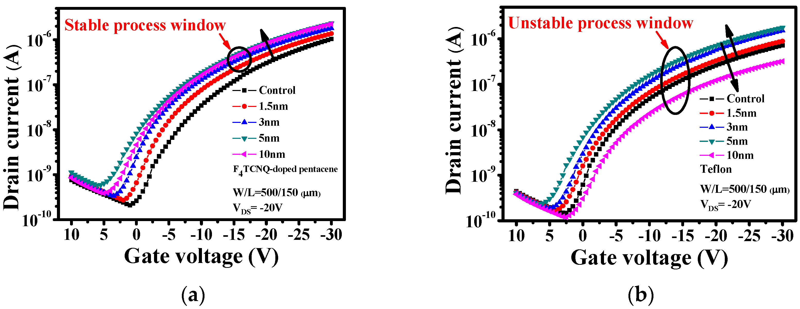 - Wakatsuki, Y.; Noda, K.; Wada, Y.; Toyabe, T.; Matsushige, K. Molecular doping effect in bottom-gate, bottom-contact pentacene thin-film transistors. J. Appl. Phys. 2011, 110. [Google Scholar] [CrossRef]