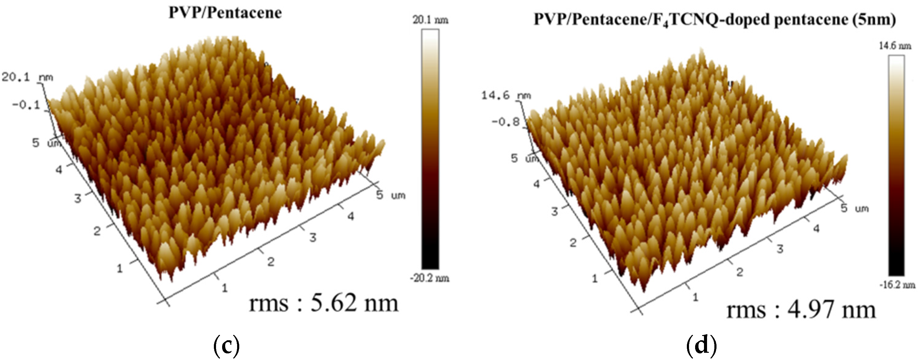 The dependence of the device performance on the thickness of the molecular-doping-type F4TCNQ-doped pentacene layer was investigated. In a previous report of the present authors, the performance of pentacene-based OTFTs was found to be strongly dependent on the thickness of the insulating-type Teflon interlayer [7]. To investigate the effect of the thickness of F4TCNQ-doped pentacene and Teflon interlayers on the device performance, the F4TCNQ:pentacene ratio of the F4TCNQ-doped pentacene interlayer was fixed at 1:1, and the thicknesses of both carrier injection interlayers were set at 0, 1.5, 3, 5 and 10 nm. Figure 4a,b shows the thickness-dependent transfer property of the device with Teflon and F4TCNQ-doped pentacene interlayers of various thicknesses. The device with Teflon interlayer showed remarkable thickness dependence, while the one with F4TCNQ-doped pentacene interlayer showed a slight dependence. In addition, Figure 4c,d shows the AFM micrographs of the pentacene layers without and with a 5 nm F4TCNQ-doped pentacene interlayer deposited on the PVP dielectric surface. The root mean square (rms) roughness for both devices without and with 5 nm F4TCNQ-doped pentacene interlayer is 5.62 and 4.97 nm, respectively. It had been clearly seen that the surface become more smooth for devices with 5 nm F4TCNQ-doped pentacene interlayer, which is necessary for providing a better contact with metal electrodes. This is the mechanism for lowering the barrier height and increasing the charge injection, and then improving device performance. The field-effect mobility (μFE) was calculated for a VGS value of −30 V in the saturation region, and the threshold voltage (VTH) was determined according to the saturation region of the plot of |IDS|1/2 versus VGS [18]. The sub-threshold swing (SS) was calculated using the equation SS = dVGS/d(log10|IDS|). The maximum and minimum values of IDS at a VDS of −20 V were designated as ION (on current) and IOFF (off current), respectively [19]. The thickness-dependent properties of pentacene-based OTFTs with Teflon and F4TCNQ-doped pentacene interlayers of various thicknesses were summarized in Table 1.