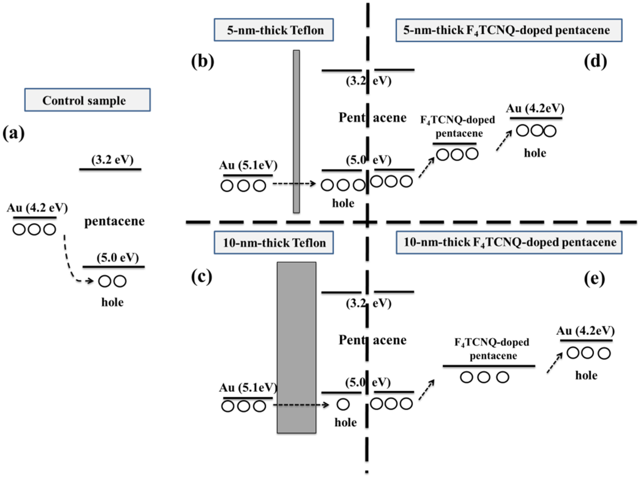 Band diagram of top-contact (TC) pentacene-based OTFTs with various interlayer thicknesses (a) control sample, (b) 5-, and (c) 10-nm-thick Teflon and (d) 5-, and (e) 10-nm-thick F4TCNQ-doped pentacene.