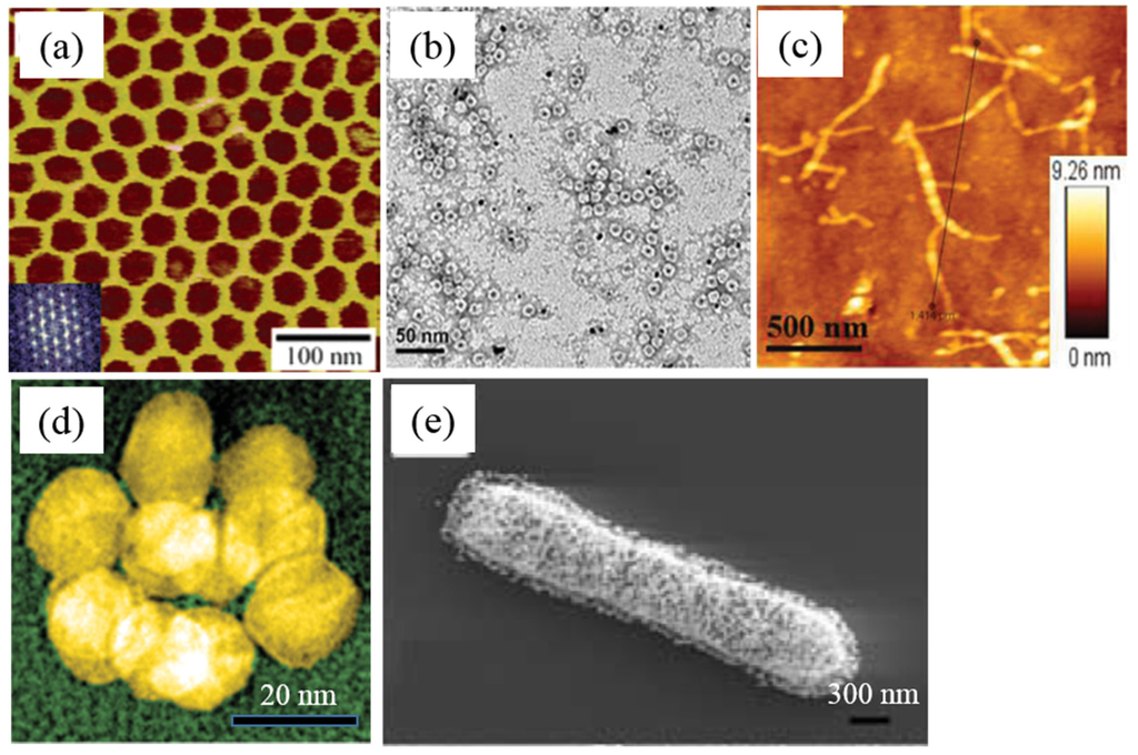 Biomimetic nanostructures: (a) DNA 2D structure (Reprinted with permission from [], published by American Chemical Society, 2005); (b) ferritin-based Pt NPs (Reprinted with permission from [], published by American Chemical Society, 2013); (c) peptide nanofiber-graphene quantum dot hybrids (Reprinted with permission from [], published by WILEY-VCH Verlag GmbH & Co., 2015); (d) virus-protein hybrid nanostructures []; (e) bacterium-based NPs (Reprinted with permission from [], published by WILEY-VCH Verlag GmbH & Co., 2005).